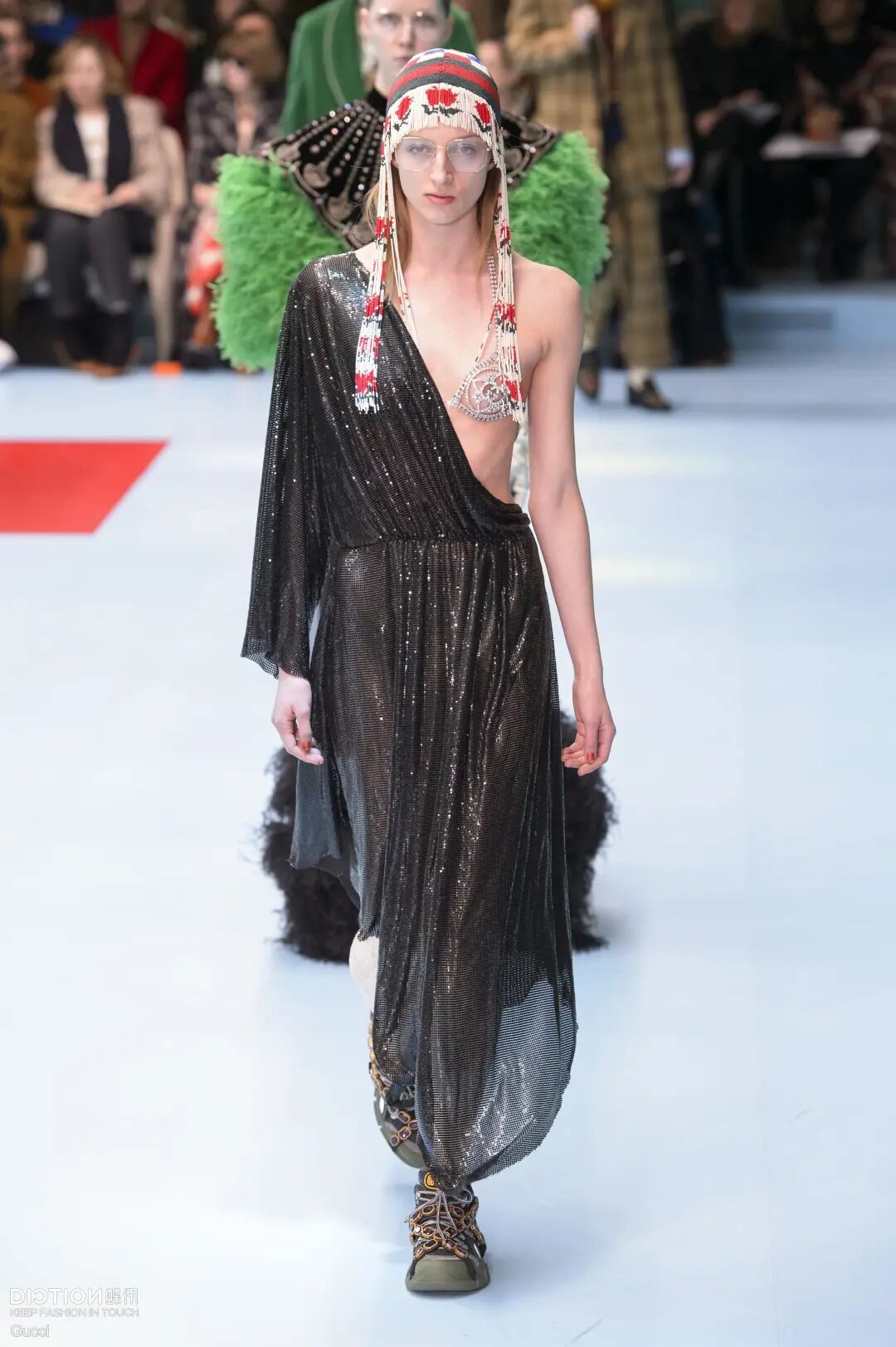 Alessandro Michele钟爱自然垂坠的设计手法,仅采用面料与重力的共同作用,为服饰带来犹如雕刻艺术般的女神褶皱,仿佛是从复古画卷中走出来的希腊女神。