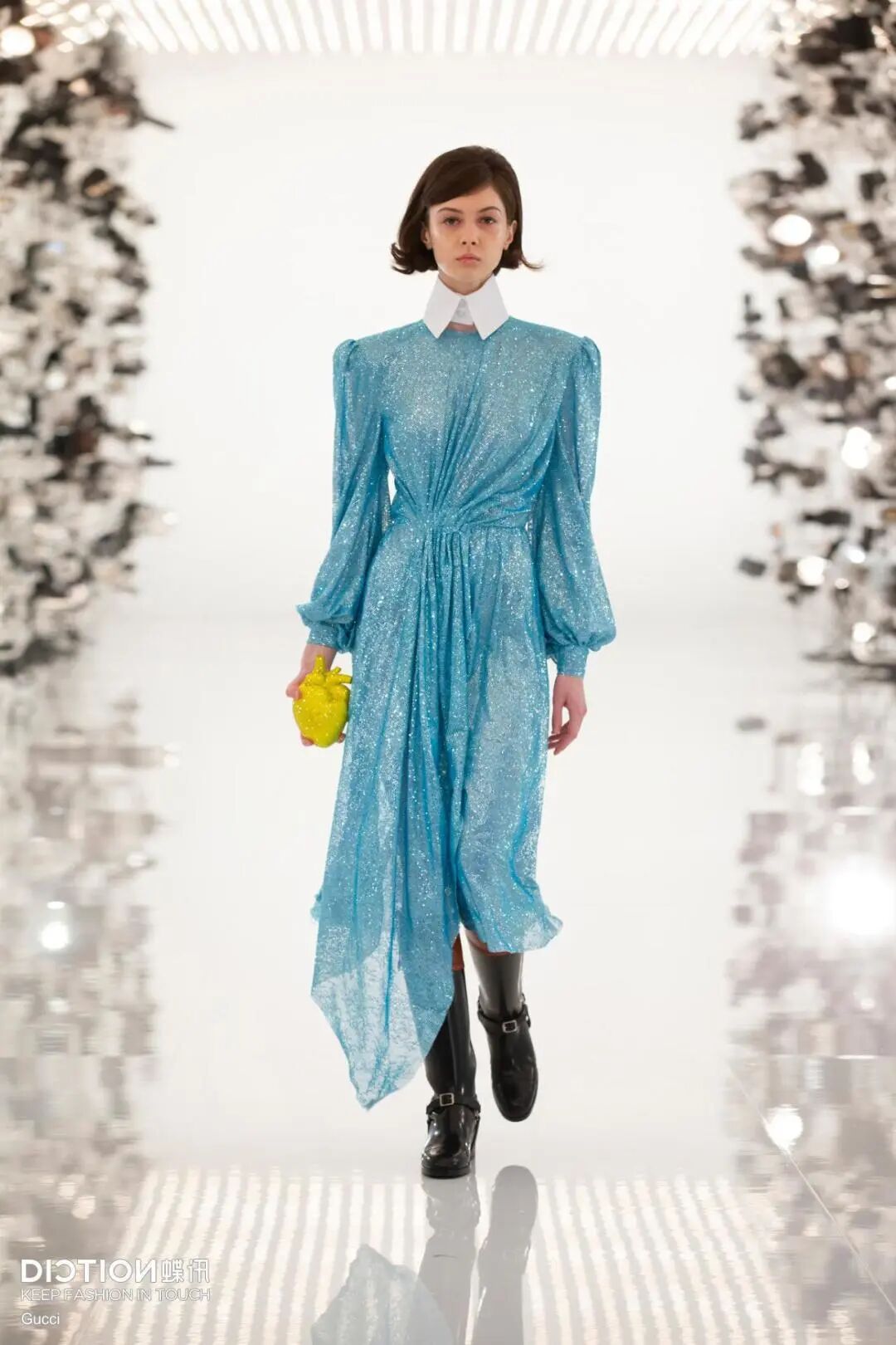 Alessandro Michele所描绘的GUCCI女人是感性的、诗意的,他用柔美感的荷叶边语言描绘她们的女性气质,无论是簇状出现的木耳边饰,还是大面积装点的压褶荷叶边,都为造型注入满满柔美感。