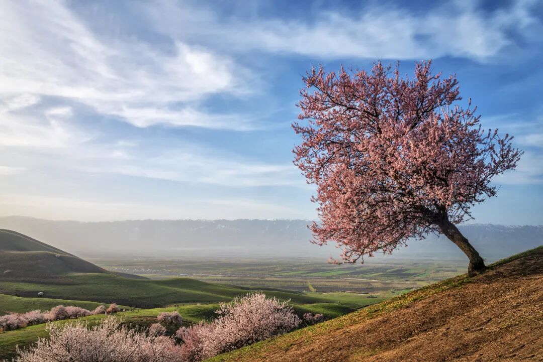 由南向北次第开放的杏花将广袤的新疆大地渲染成粉色,怒放在河谷中、雪山下,拉开新疆整个花季的序幕。