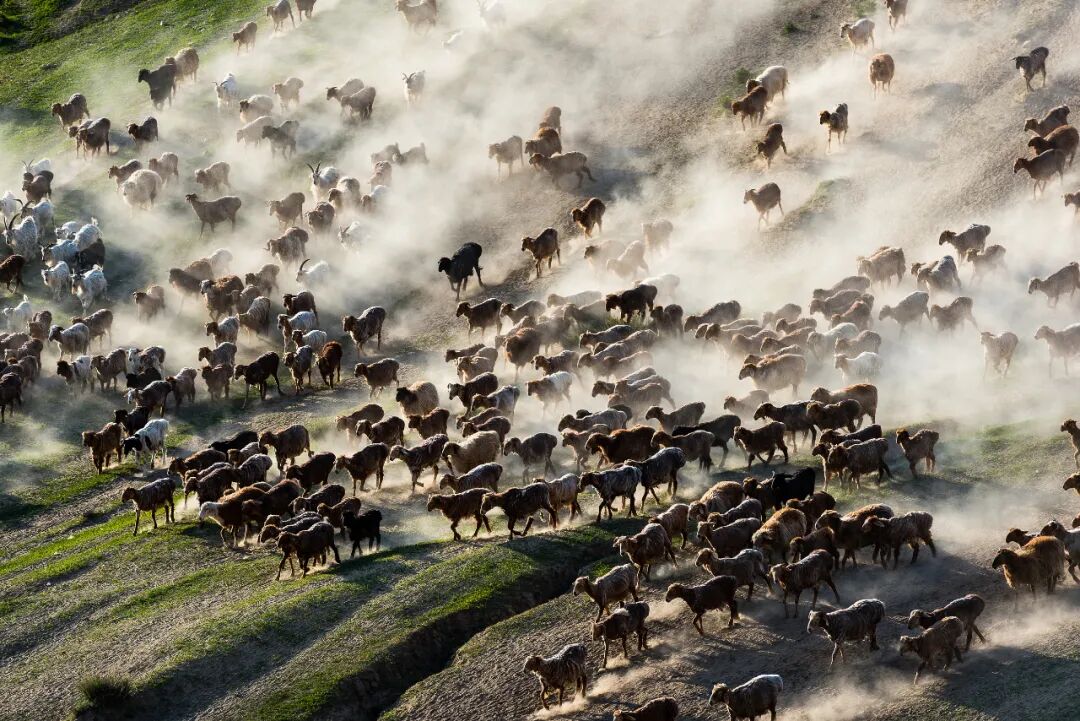 每年春季,冰雪消融后,新疆的牧民就会赶着牲畜从冬牧场前往春秋牧场。转场中,羊群等牲畜队伍浩浩荡荡,颇为壮观。