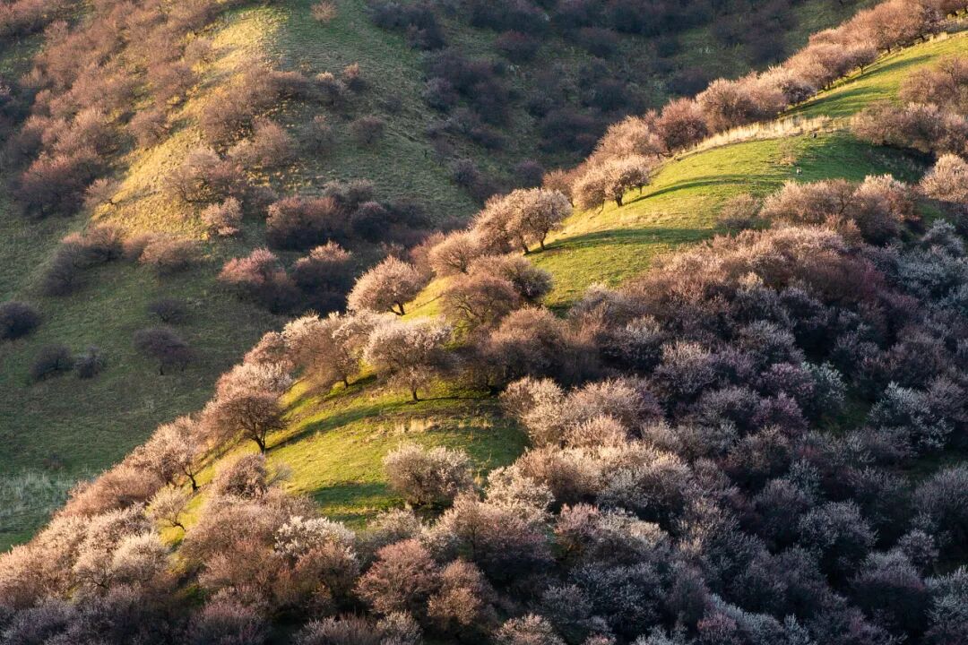 若是在3月至4月来到伊犁河谷,离开河谷底部向着草原带和针叶林带之间的落叶阔叶林带前进,你会发现漫山遍野的野杏花。