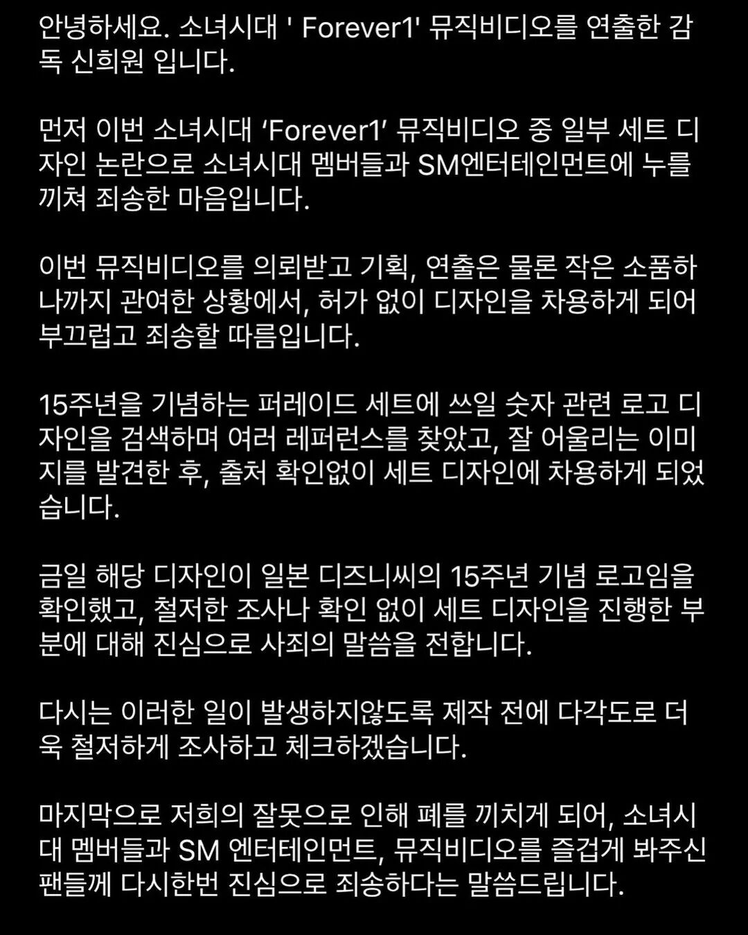 也就是说此次少女时代出道15周年的背景板是从网上拿来直接用的,而在该位导演的道歉声明中却出现的是借用设计一词,也是让人开了眼。