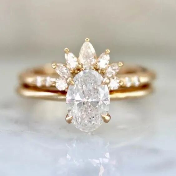 由于这种单圈叠戴的护戒和钻戒并不是一体的,大家可以根据习惯调整各个戒指之间的距离,因此可用于多种相似轮廓主石的钻戒上。比如大小接近的椭圆形钻石、圆形钻石、水滴形钻石偏圆的一侧,都可以用同一款护戒来搭配。