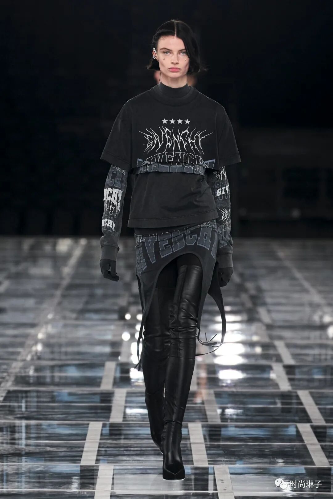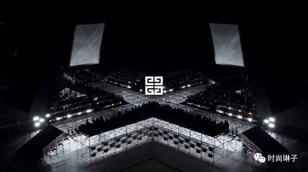 Givenchy纪梵希2022 秋冬时装秀 以巨型的十字秀台取代了传统T台,摩登的两层楼结构建筑被 LED 灯照亮,以音乐盛典的姿态打造出充满光明的服饰语言。