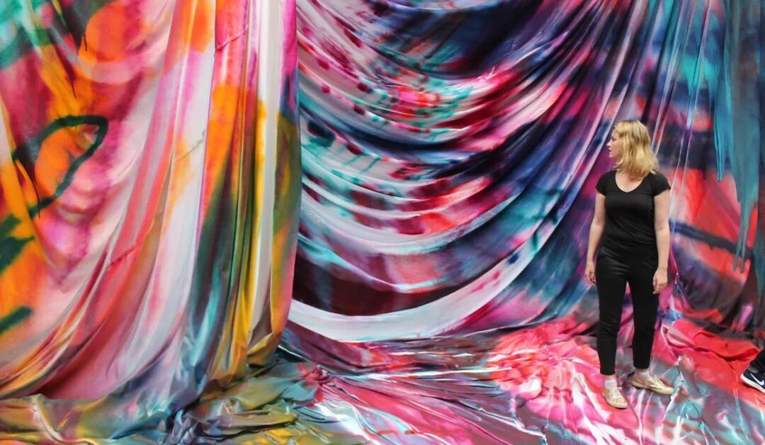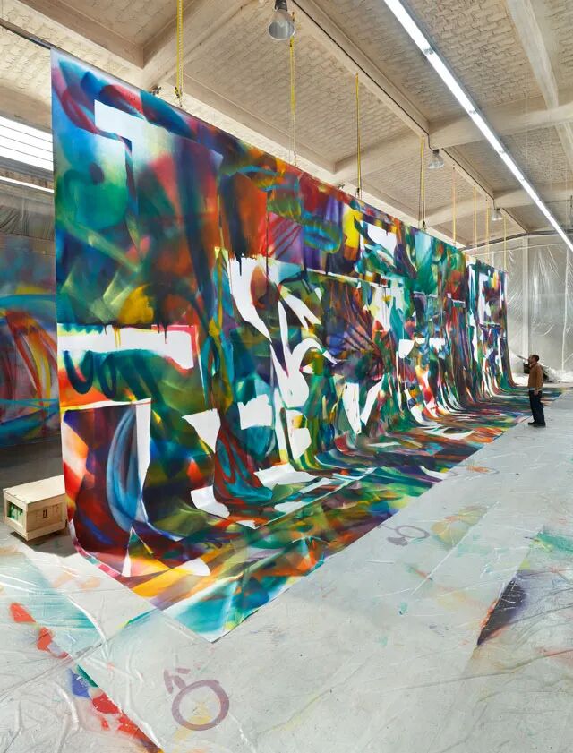 她的的实践是一种令人陶醉的极繁主义鸡尾酒,混合了抽象表现主义的夸夸其谈、迷幻视觉效果和大地艺术尺度。被她压缩、罐装并以每小时一百英里的速度从喷漆枪的枪管中射出。
