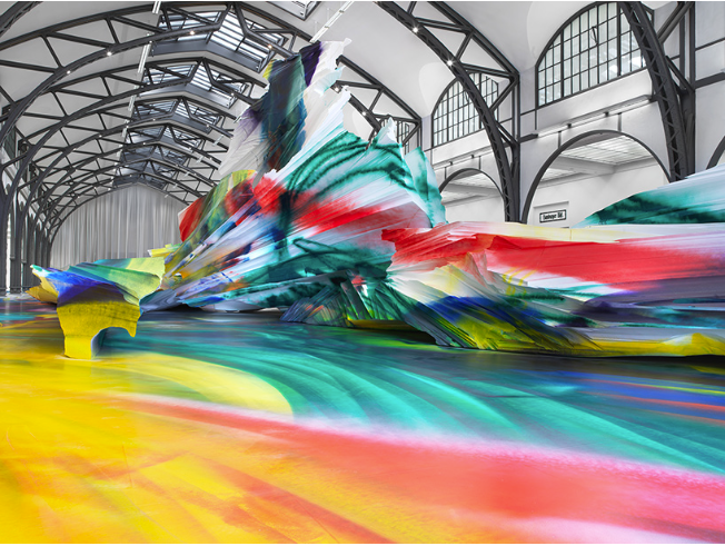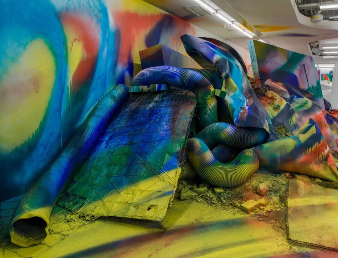 被激发的狂热步伐、未经过滤、充满活力的可能性。拒绝视觉叙事或图形结构的惯例,留下的是这些看似史前的涂鸦,充满了活力,沐浴在彩虹辐射的热量中的大型装置场景。