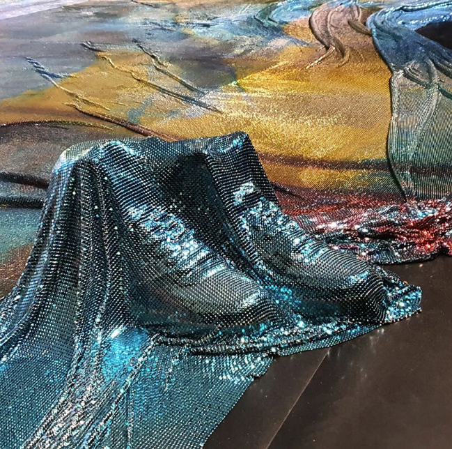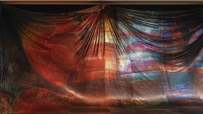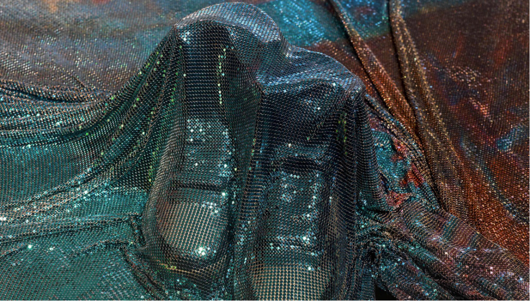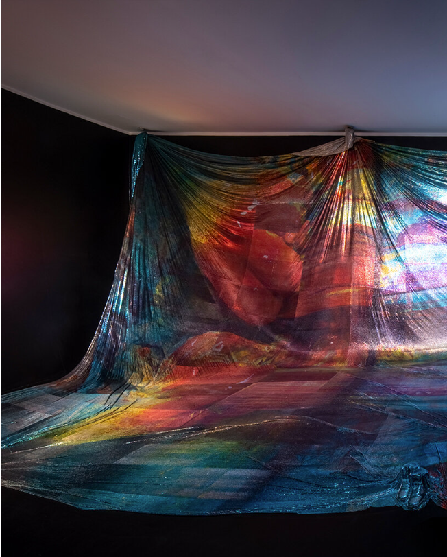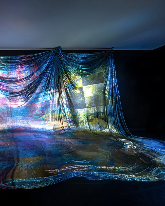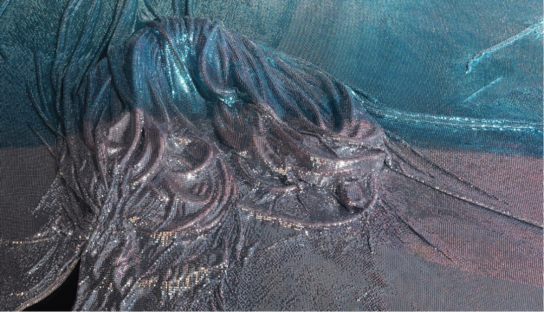 “阿波罗,阿波罗”以空灵的棱镜面纱的形式成形,从墙上戏剧性地展开到地板上,覆盖着散落在周围的物体。该装置由金属网眼织物制成,与黑色背景形成闪闪发光的对比,其身体轻轻接触墙壁。