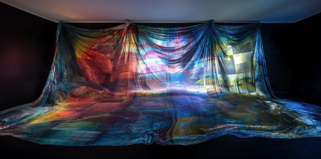 面纱类似于针织亮片,环绕着地板和墙壁,下面隐藏着各种物体,例如一双靴子和一把折叠椅。