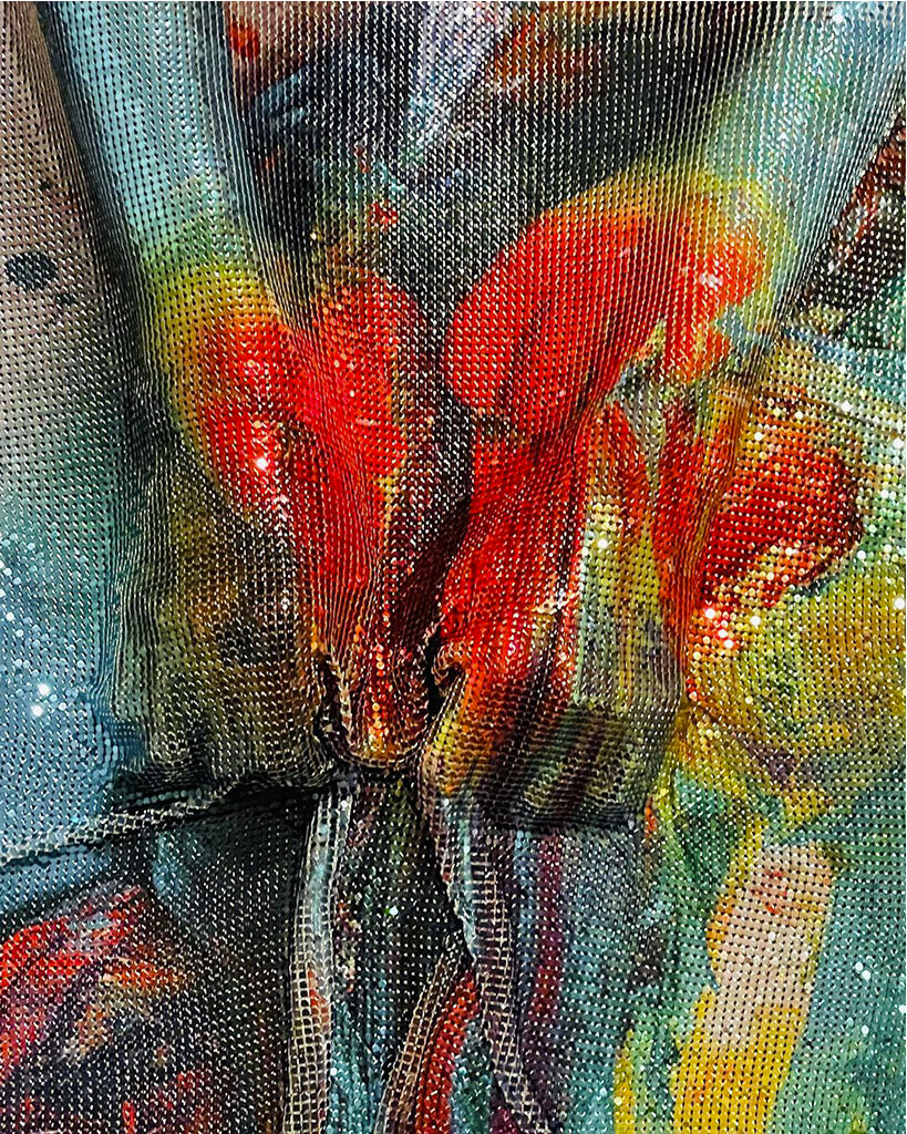 “Apollo, Apollo”在网布上印有艺术家双手的合成图像。这一姿态描绘了绘画与摄影、图像与身体、真实与幻觉之间界限模糊的时刻。说:“绘画跃入一种未知的现实感,如现在、如房子、如多功能、如精神。”