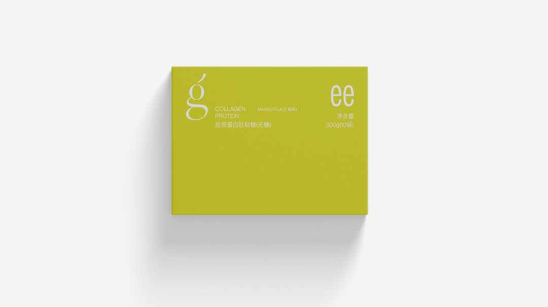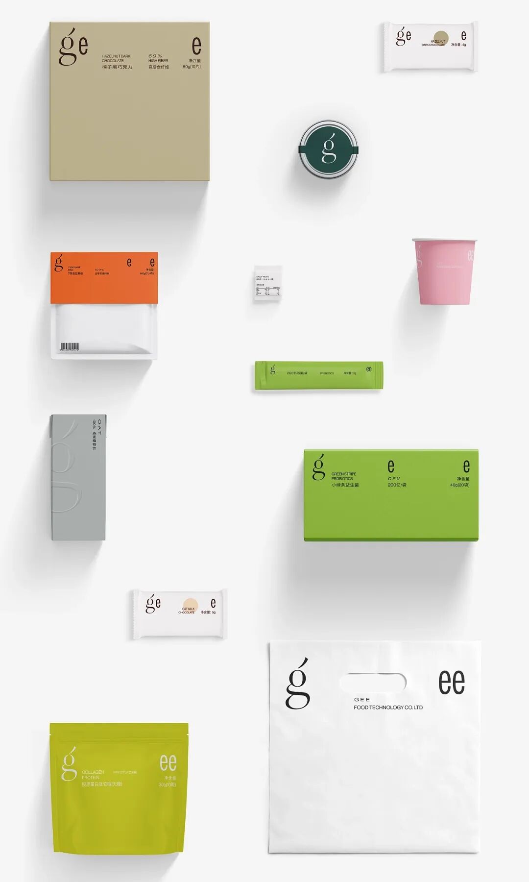 gee,主要针对当代年轻女性,借助现代科技研发出健康、营养且便携的食品。标识强调最美字母“g”,整体融合了传统与现代的风格,做出严谨的比例及黑度处理,延伸以排版为重点,传递轻盈,平衡,创新多元的品牌气质。