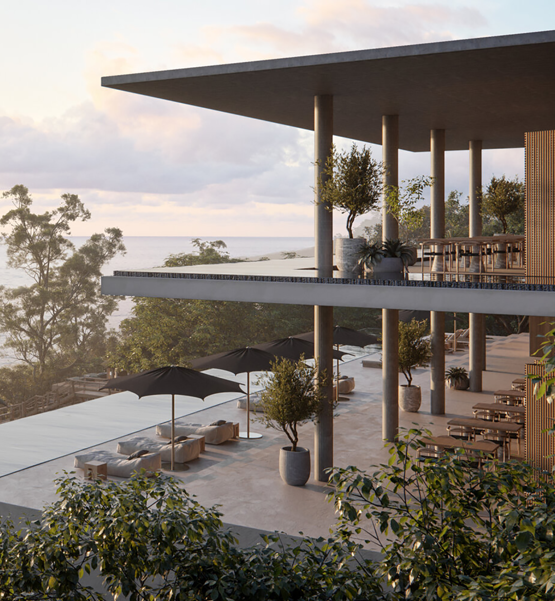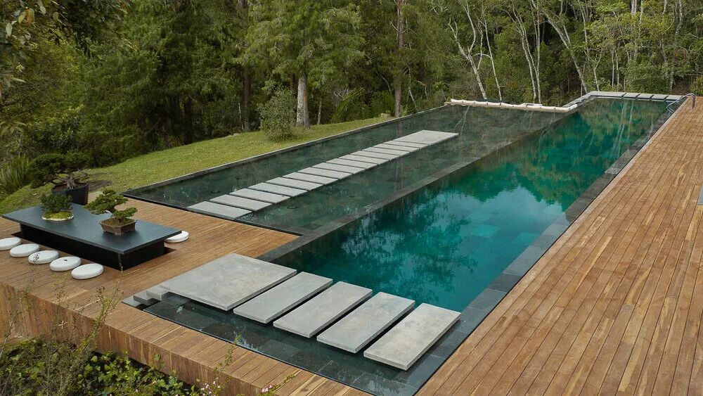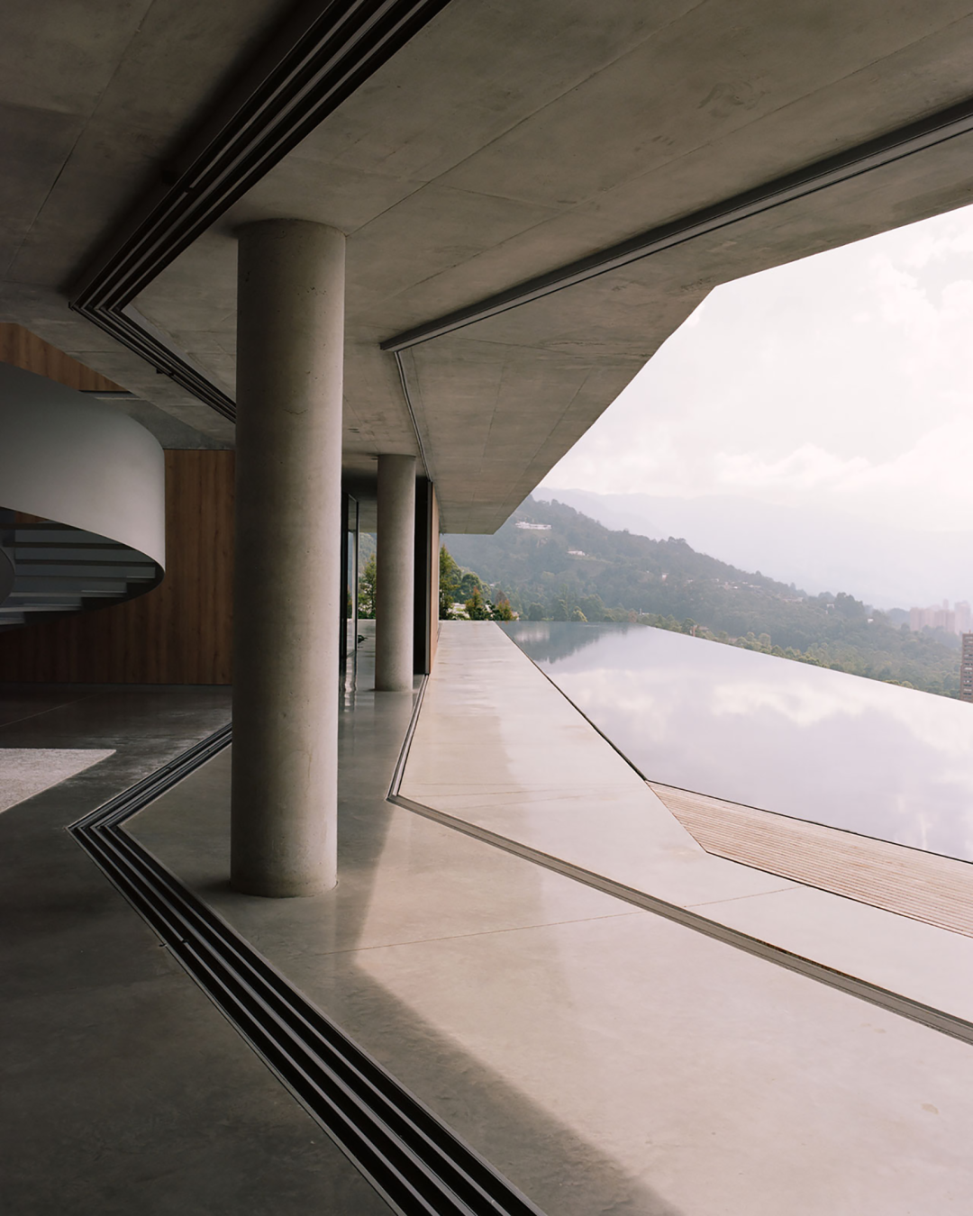 位于山顶斜坡上的别墅,特色为大尺度的悬挑结构。建筑以混凝土为基调,面向山间延伸无边际泳池,创造视野开阔的建筑风景。