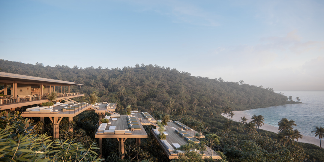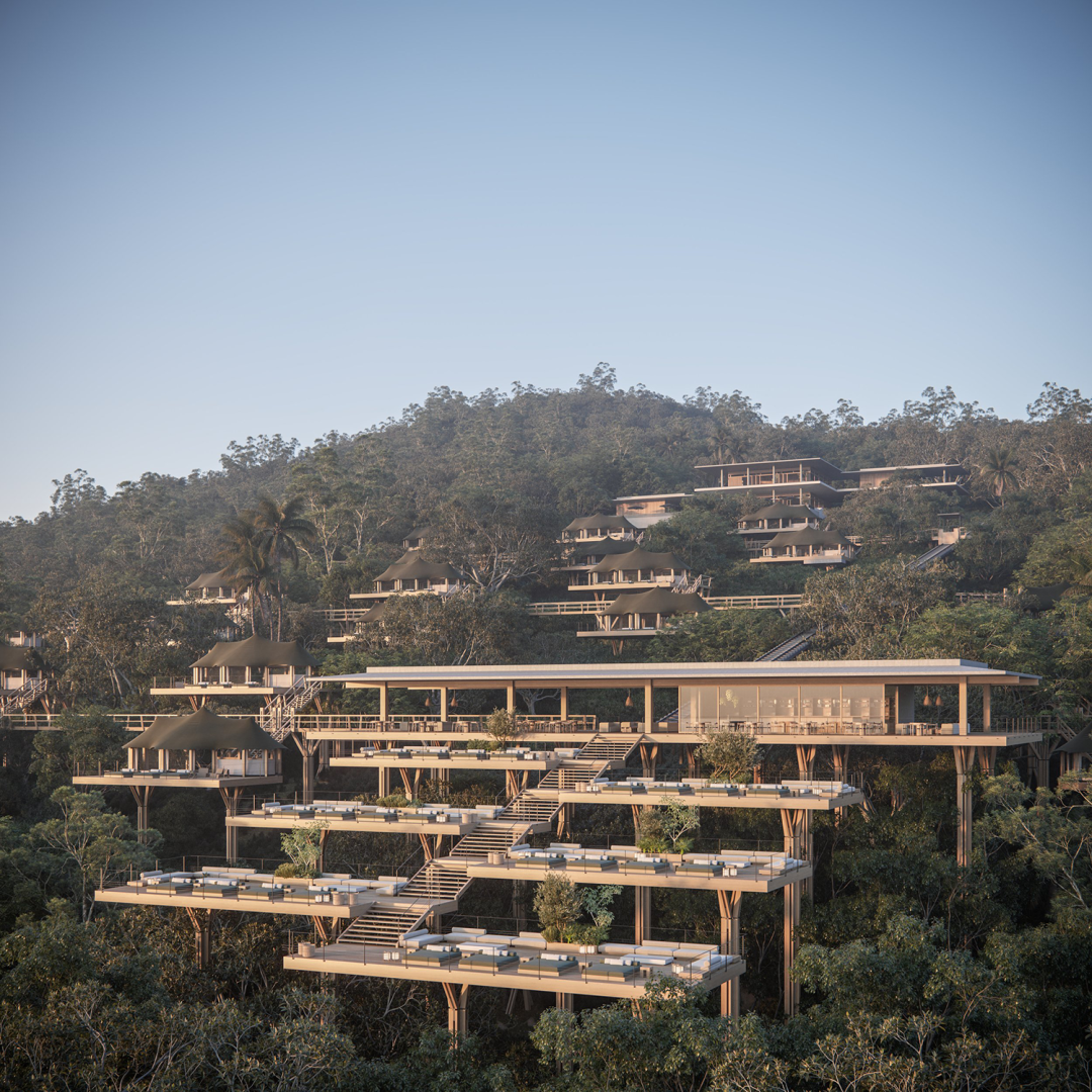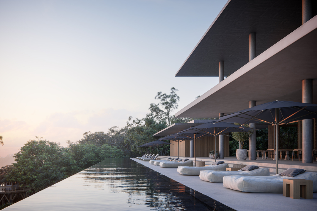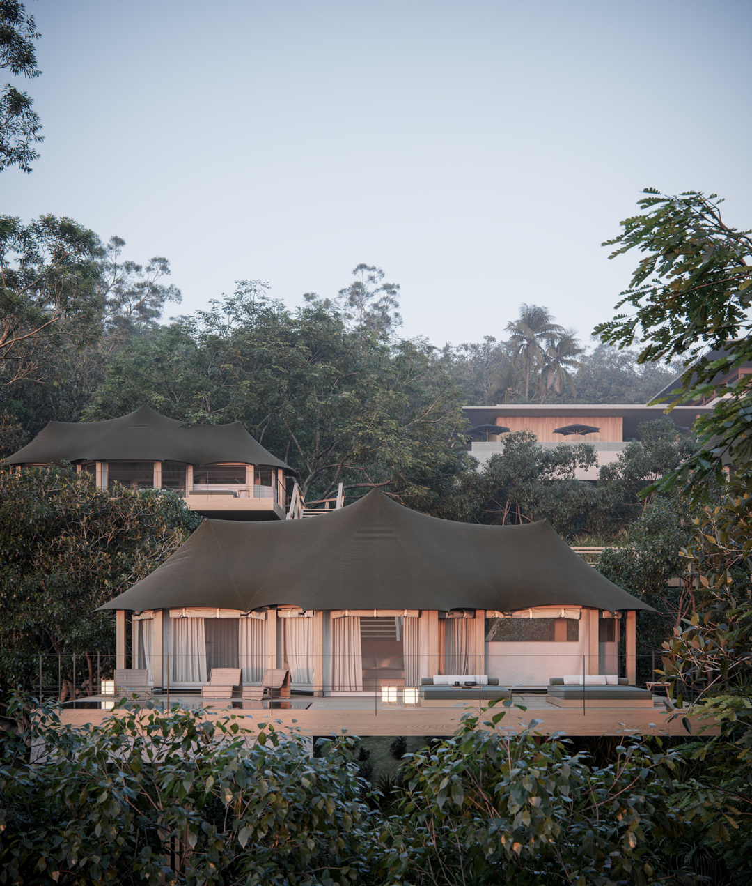 极简的建筑线条比例完美与山林坡地相融,建筑腾空而立,隐秘于自然中,包含现代风格与帐篷式套房的双重趣味。