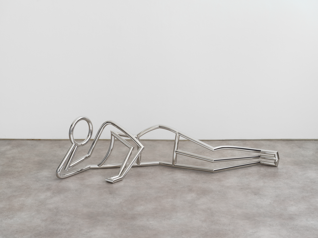 Julian Opie, Figure 1, position 2., 2022, Polished stainless steel, 43 x 172 x 40 cm, 16 7/8 x 67 3/4 x 15 3/4 in © Julian Opie. Courtesy Lisson Gallery. Photography by Alex Delfanne
