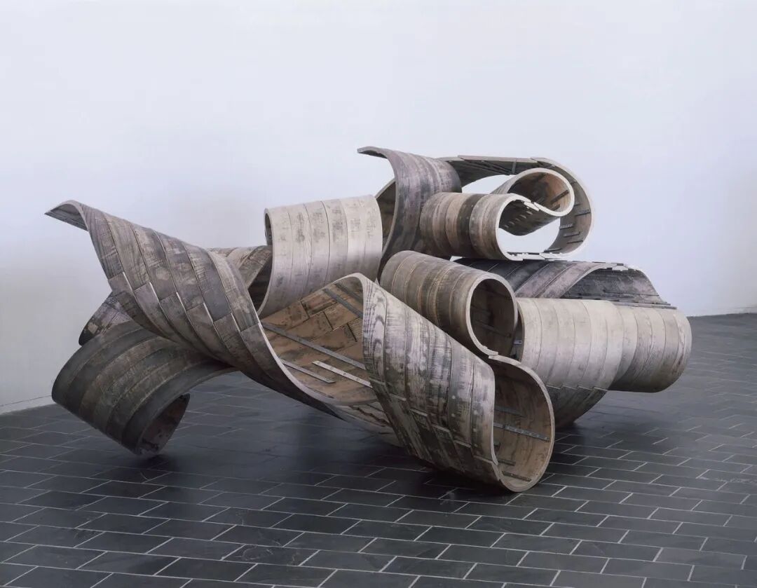 Richard Deacon, Restless, 2005, Steamed ash and stainless steel, 158 x 374 x 257 cm, 62 3/16 x 147 1/4 x 101 3/16 in © Richard Deacon. Courtesy Lisson Gallery