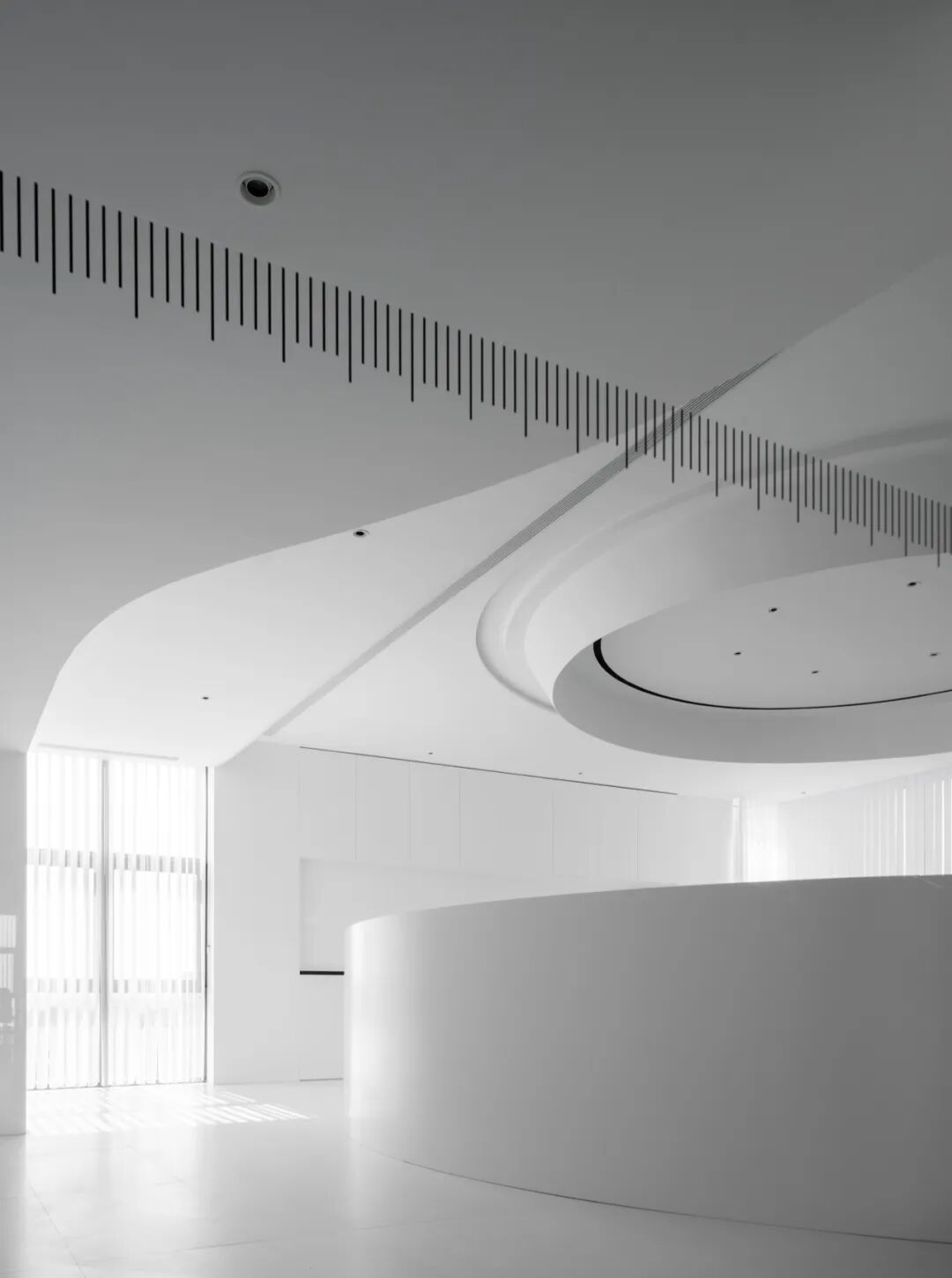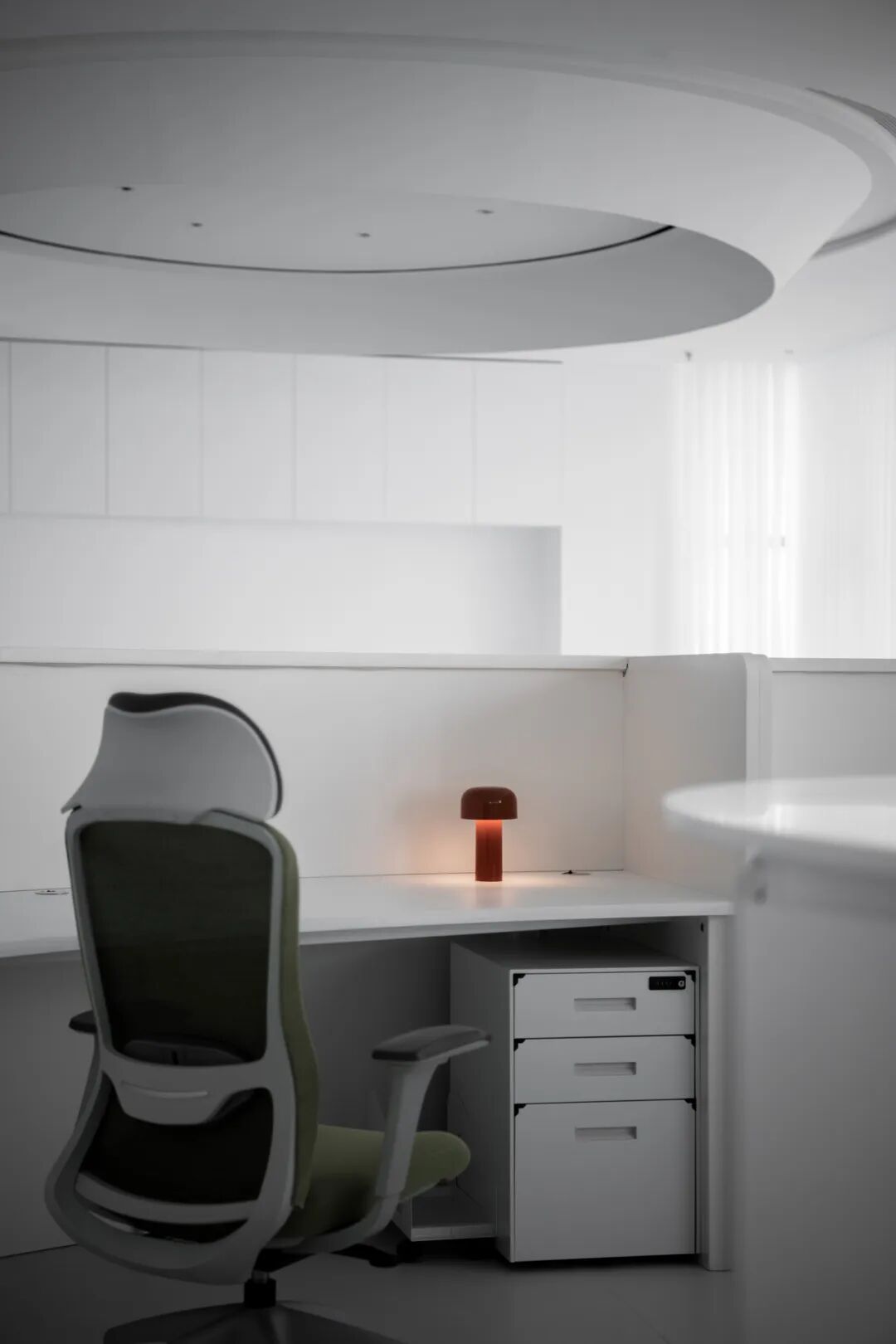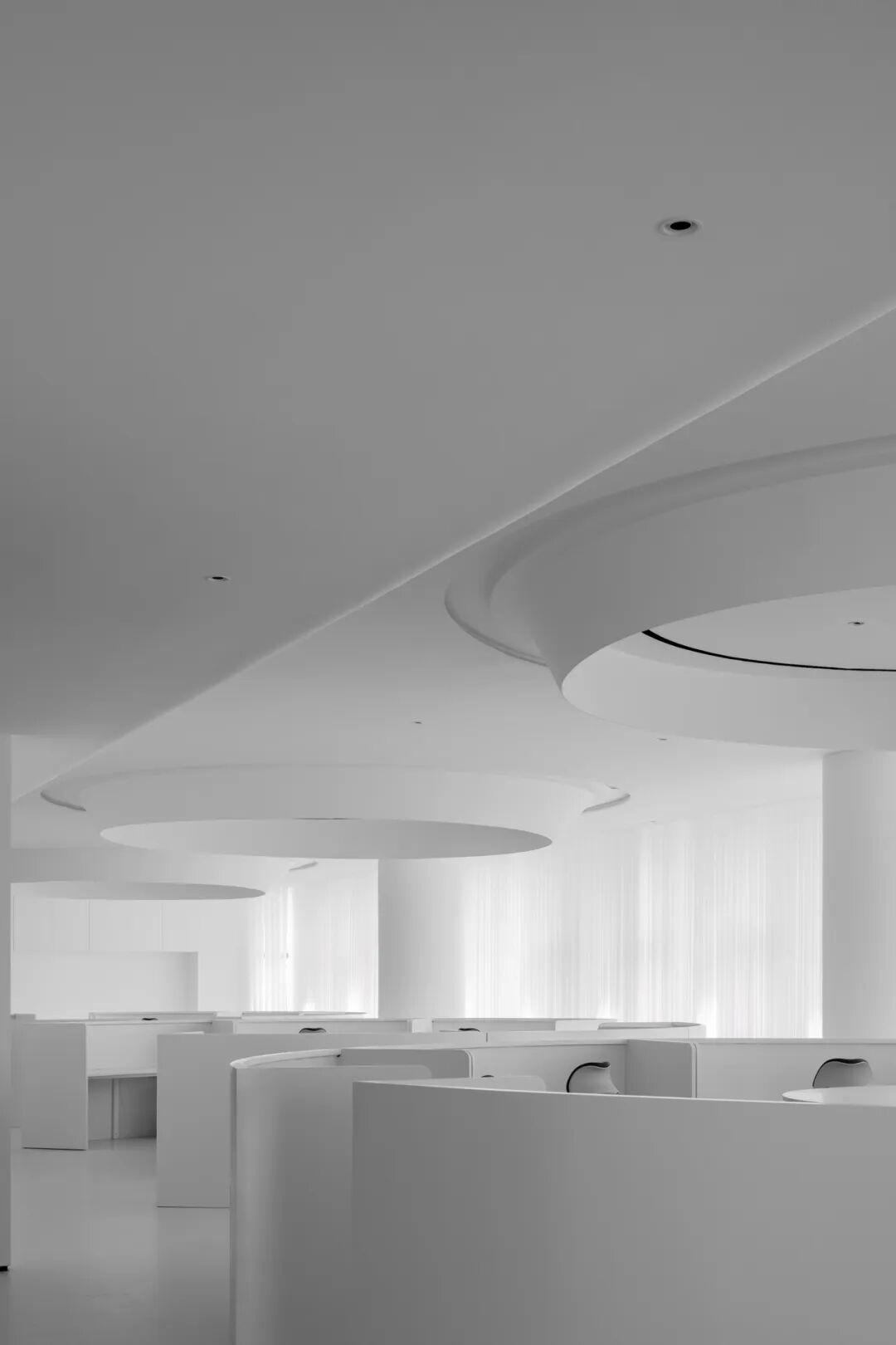 海鸥手表是中国第一只机械表的诞生地。在这里,集见设计的创始人兼设计总监李新喆将“圆形表盘”作为探索办公空间的开始,用极简、灰白表达时间,让人感觉仿佛置身于精密表盘内部。