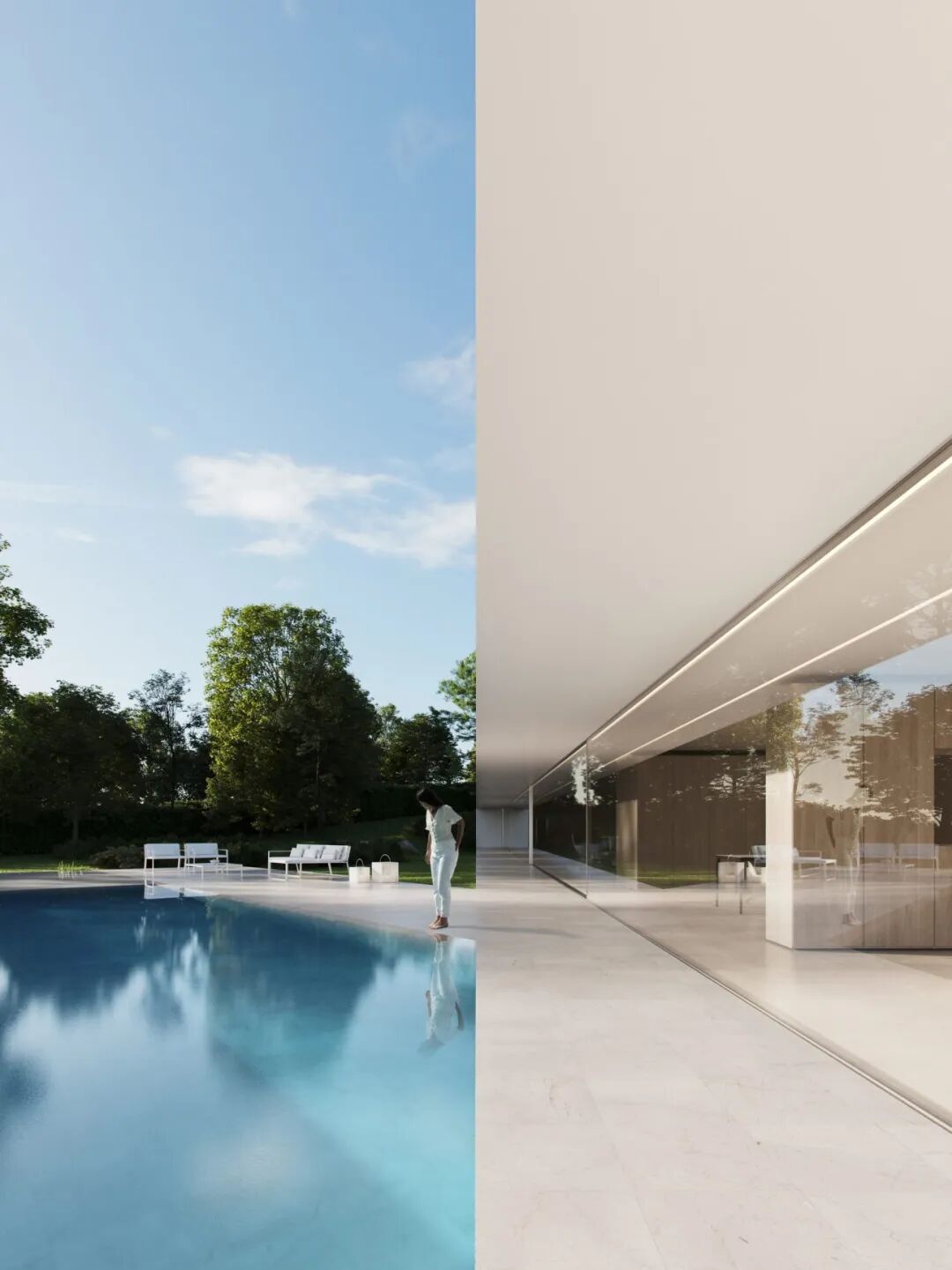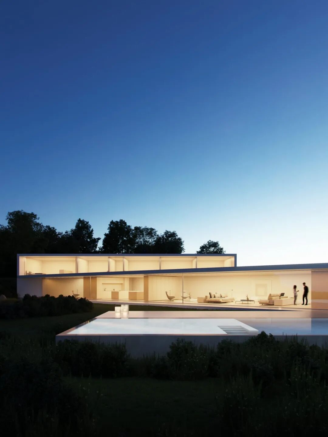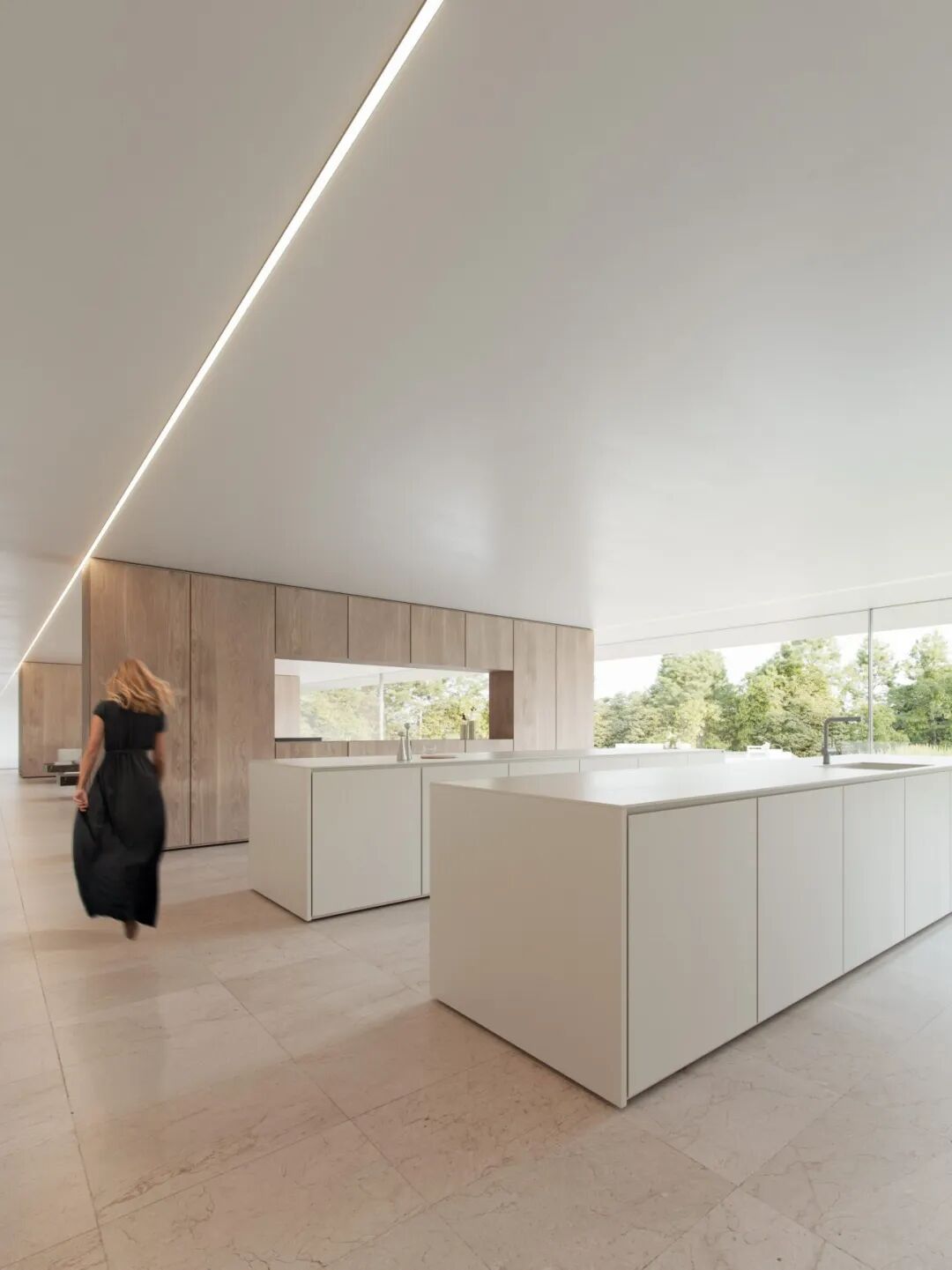 Through its configuration of three uninterrupted succession of spaces, the structure lures the eye into following its shape; an almost playful figure that immediately assumes and suggests the distinctive identity of the house.
