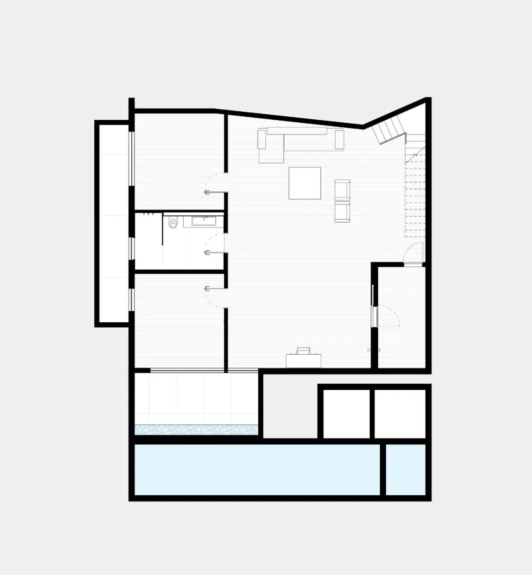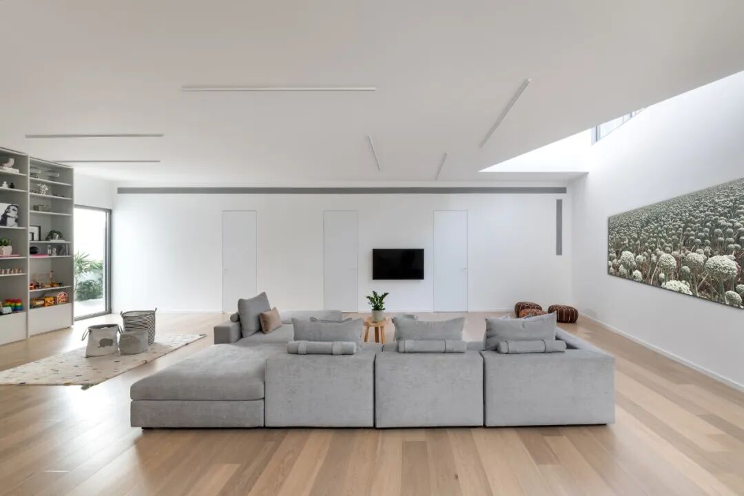 The house, comprising one floor and a basement, was built on a plot sized 408 sqm. The architectural program formulated with the family members was a challenging one. It spoke, among other things, of a transparent yet intimate, present yet unassuming ambience, a large illuminated and airy basement without the “feel” of a basement and a substantial garden.