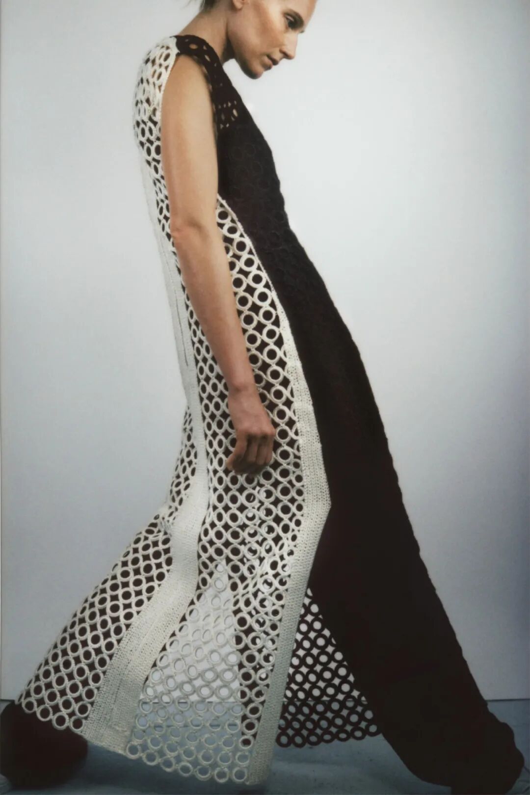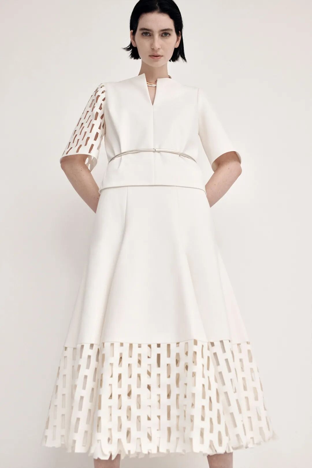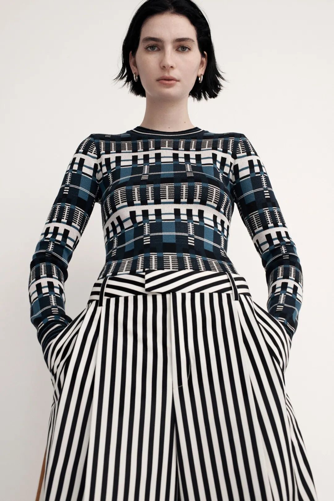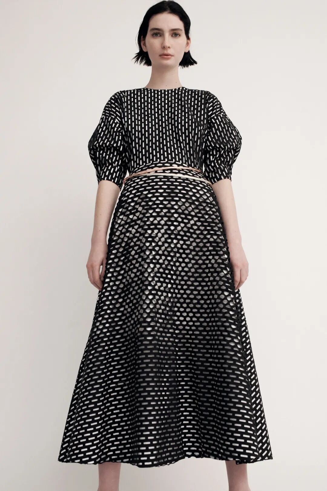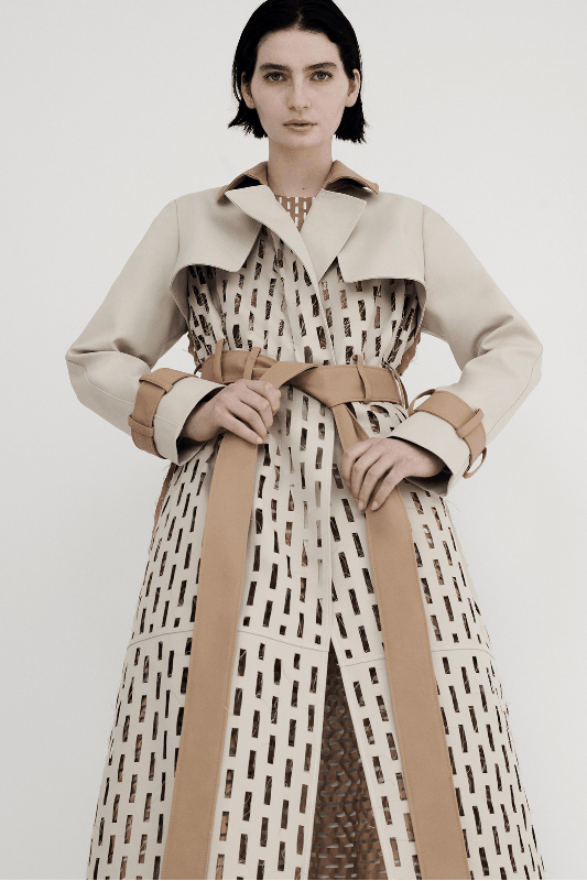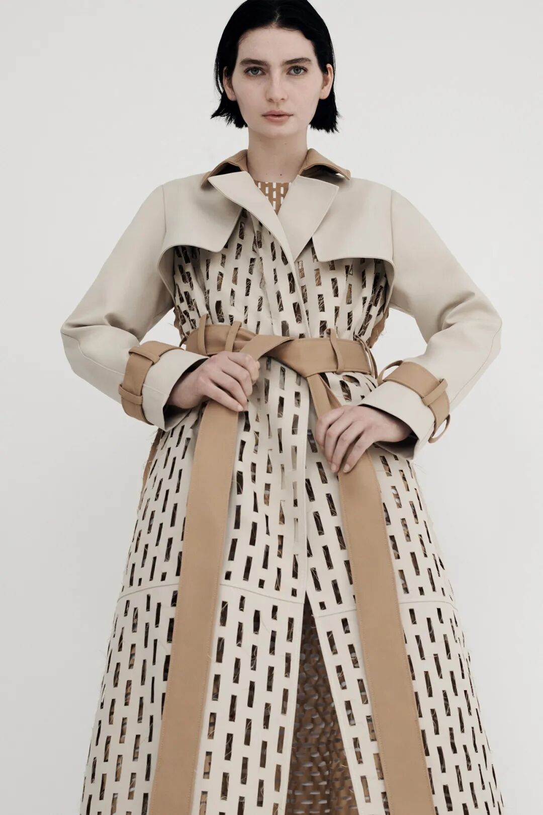 PARTOW 2022年早秋系列以一件不同以往的外套开场——一款有着许多矩形激光切口的双色调长款大衣。这些激光切割和几何针织物的灵感来自于波斯地毯,是设计师对于波斯遗产的致敬,成功为本季增添了一些大胆的新元素。