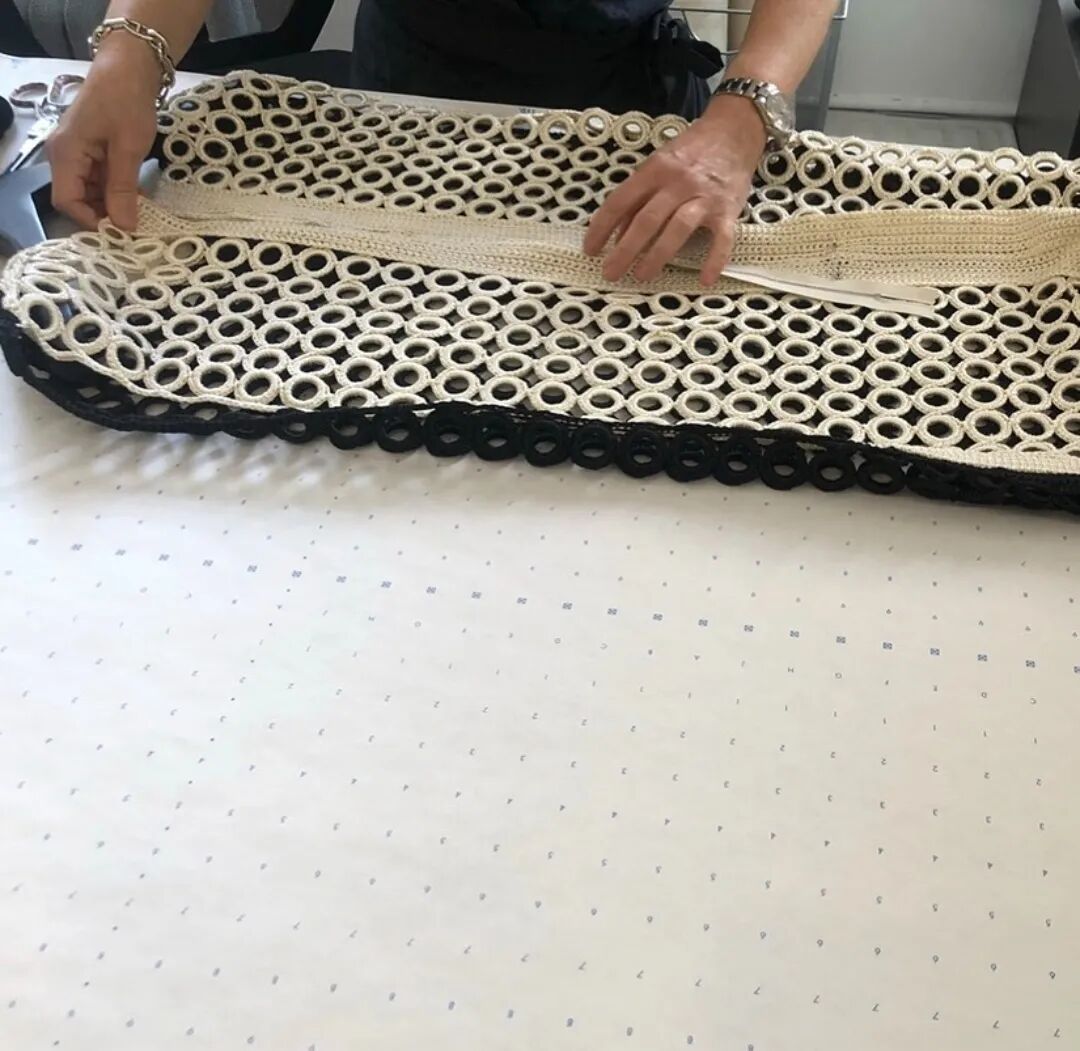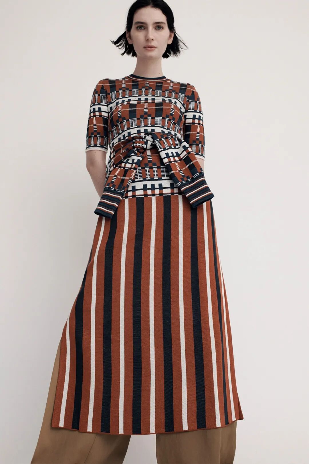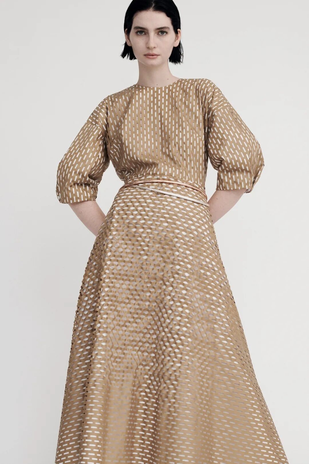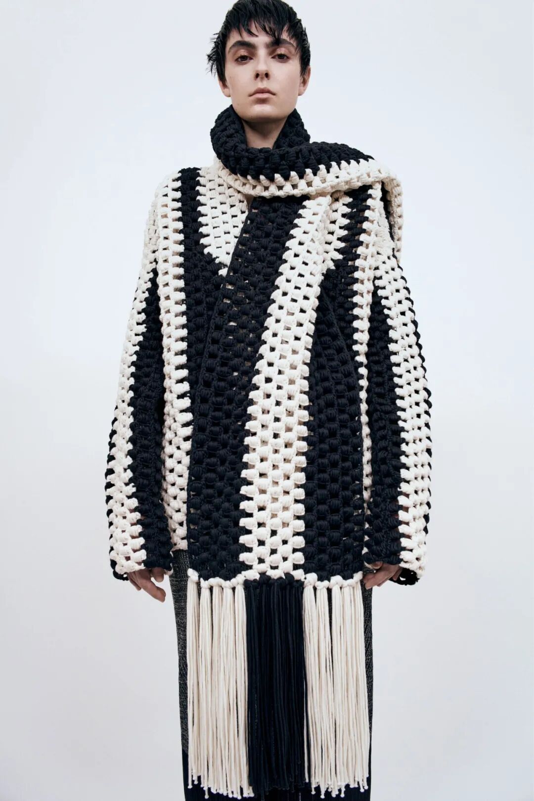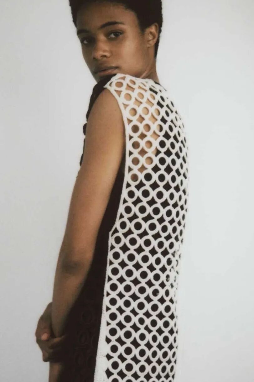 PARTOW 2022年早秋系列以一件不同以往的外套开场——一款有着许多矩形激光切口的双色调长款大衣。这些激光切割和几何针织物的灵感来自于波斯地毯,是设计师对于波斯遗产的致敬,成功为本季增添了一些大胆的新元素。