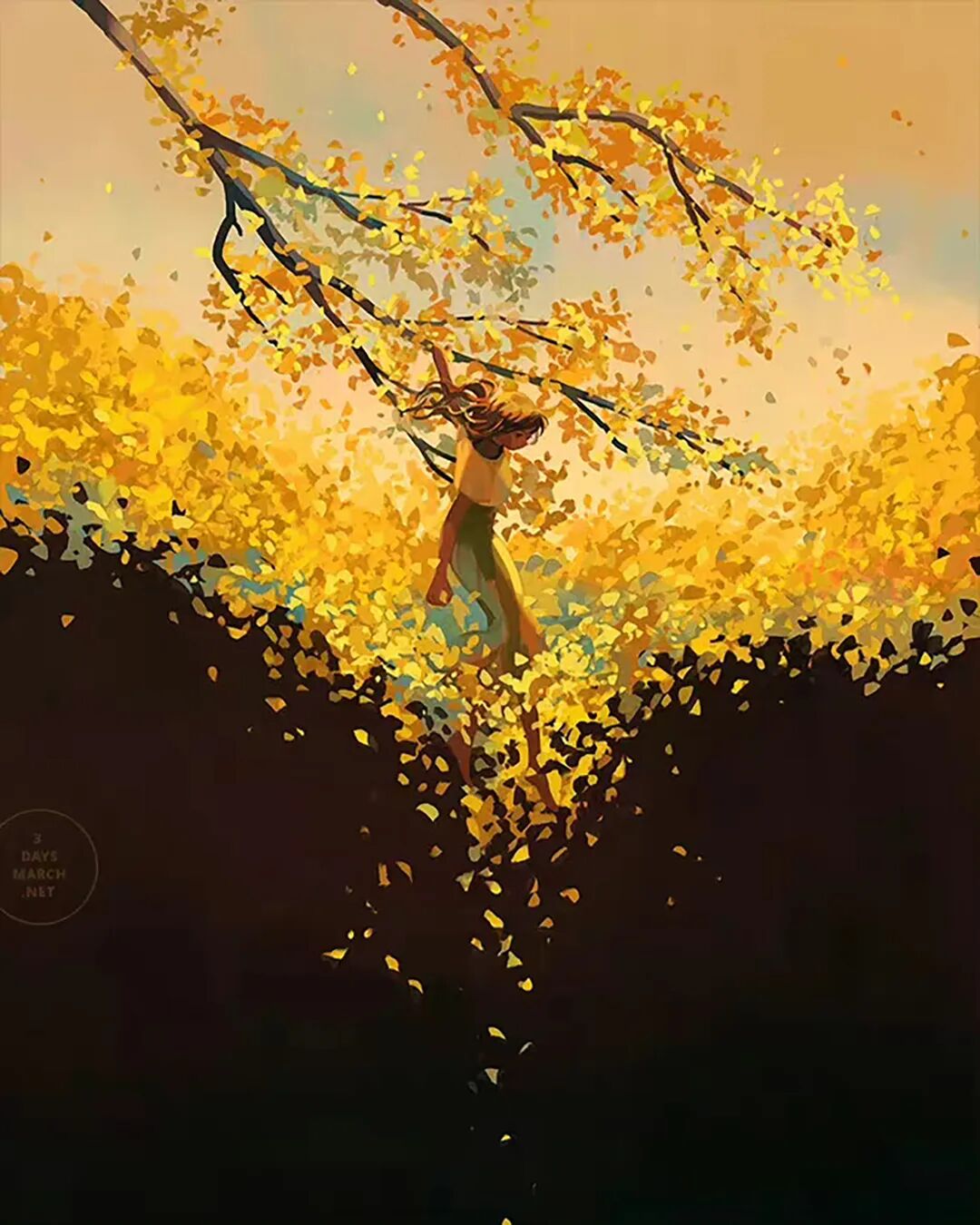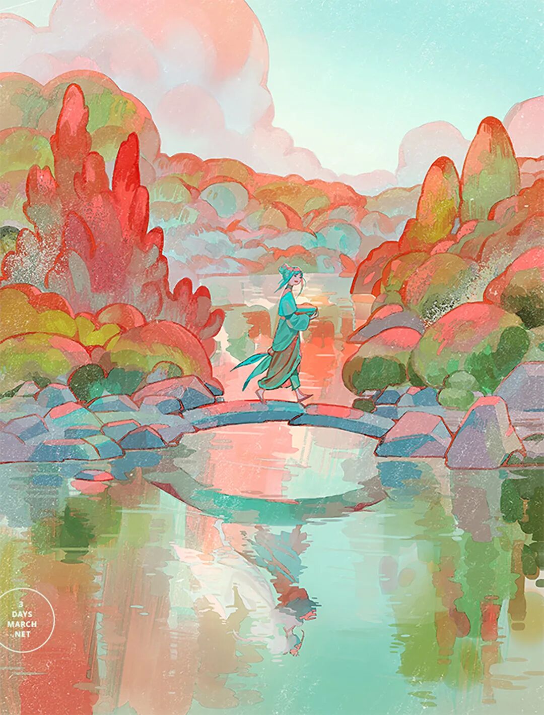 唯美的意境和温柔的配色,漂亮的光影,没有那么精致,但胜在意境。大场景小人物的画面,更容易让观者有很强的场景代入,幽静的画面充满了奇幻梦幻的氛围,故事感十足。你喜欢这一组插画作品吗?