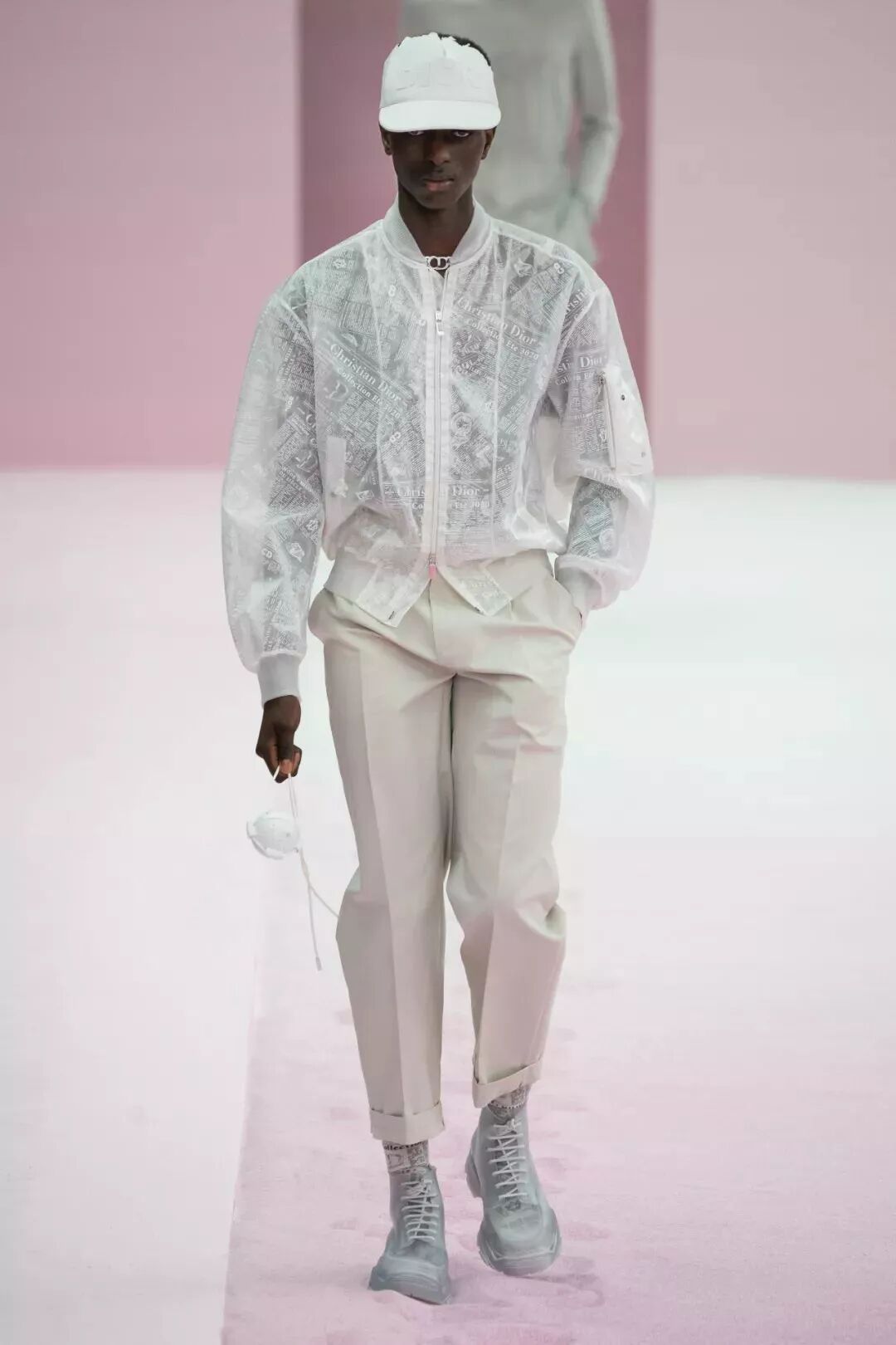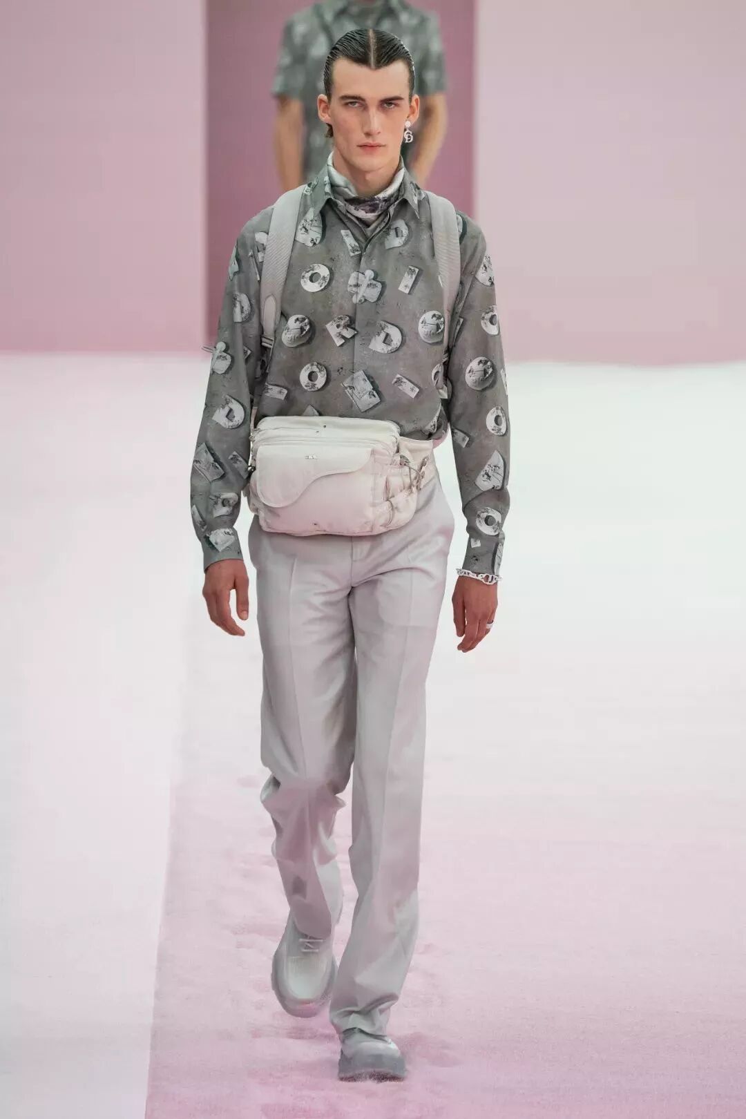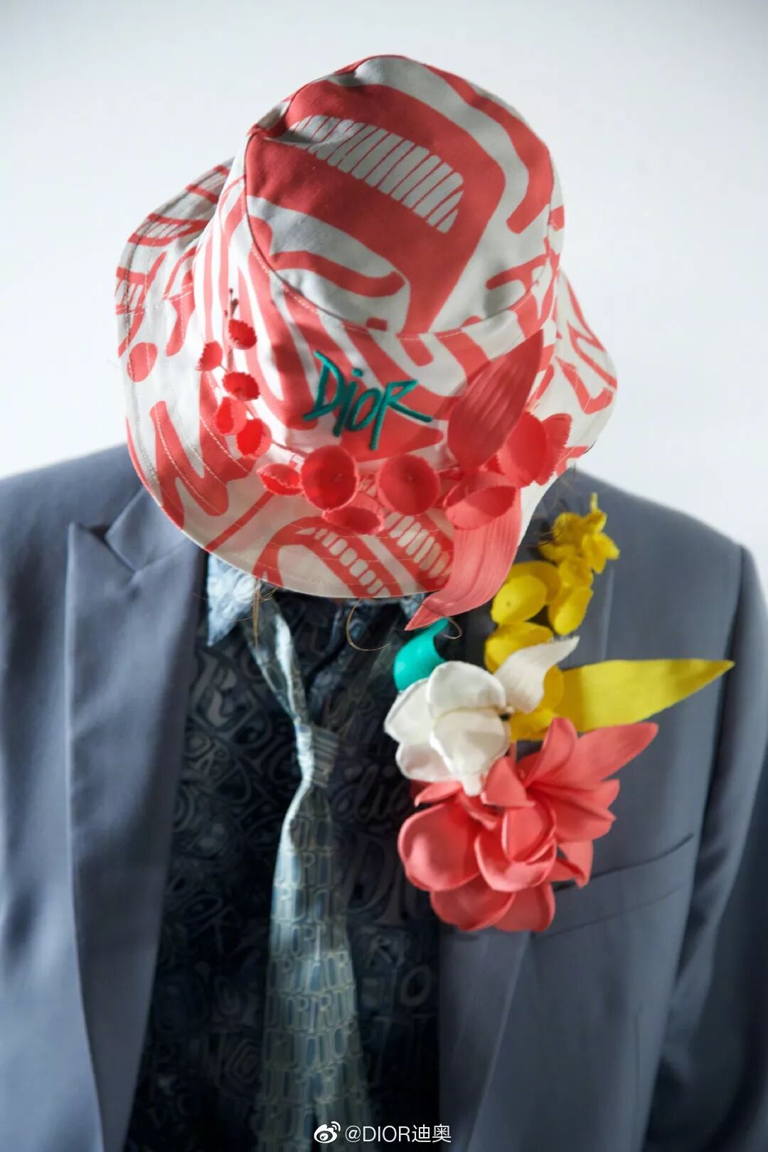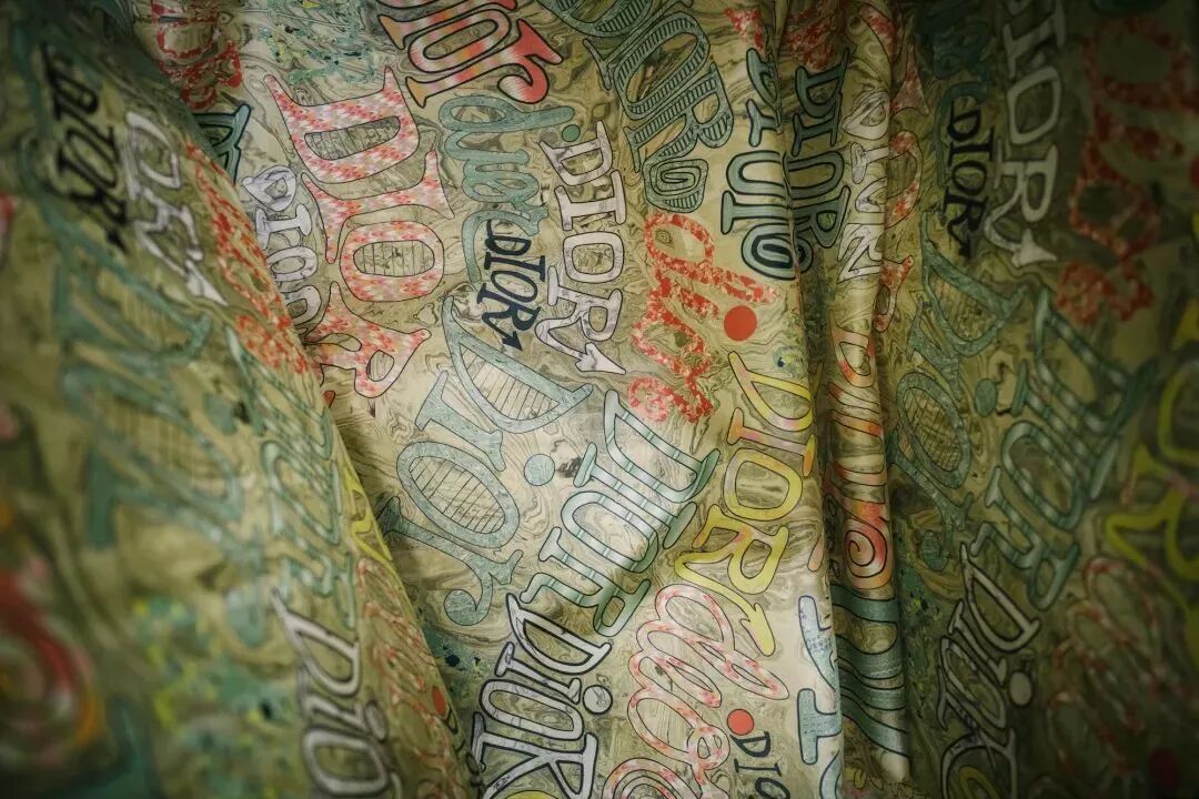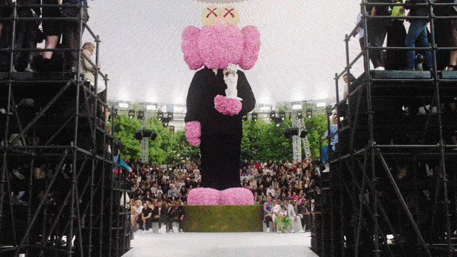 Kim Jones一直以来都沉迷于艺术家合作,从他2018年掌舵DIOR男装开始,他的每季发布都会邀请不同的艺术家合作,Kim Jones曾与街头艺术家KAWS合作打造了一个10米大的人形玩偶,在发布会邀请函上的 KAWS 卡通蜜蜂图案。