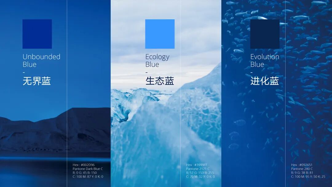 值得注意的是,蓝色一直以来也是吉利品牌最核心的识别色彩,此次更新中,吉利的蓝色并没有像上图中列举的那样将颜色提亮,而是从一个全新的角度出发,引入了源自孕育生命的海洋以及浩瀚的宇宙星空的全新的品牌色——无界蓝(Unbounded Blue)。