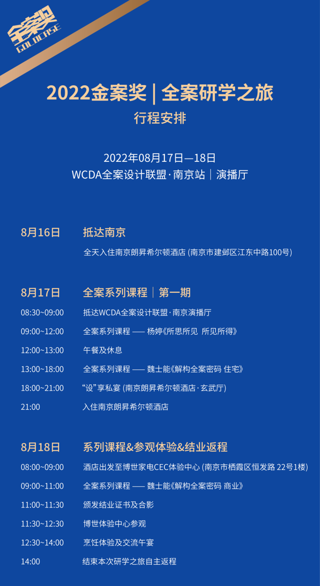 2022金案奖全案研学之旅将在 WCDA全案设计联盟 · 南京站开启!两位全案设计领域资深导师将针对传统家装行业发展的痛点和家居消费市场的发展趋势,帮助新生代设计师转型全案设计!