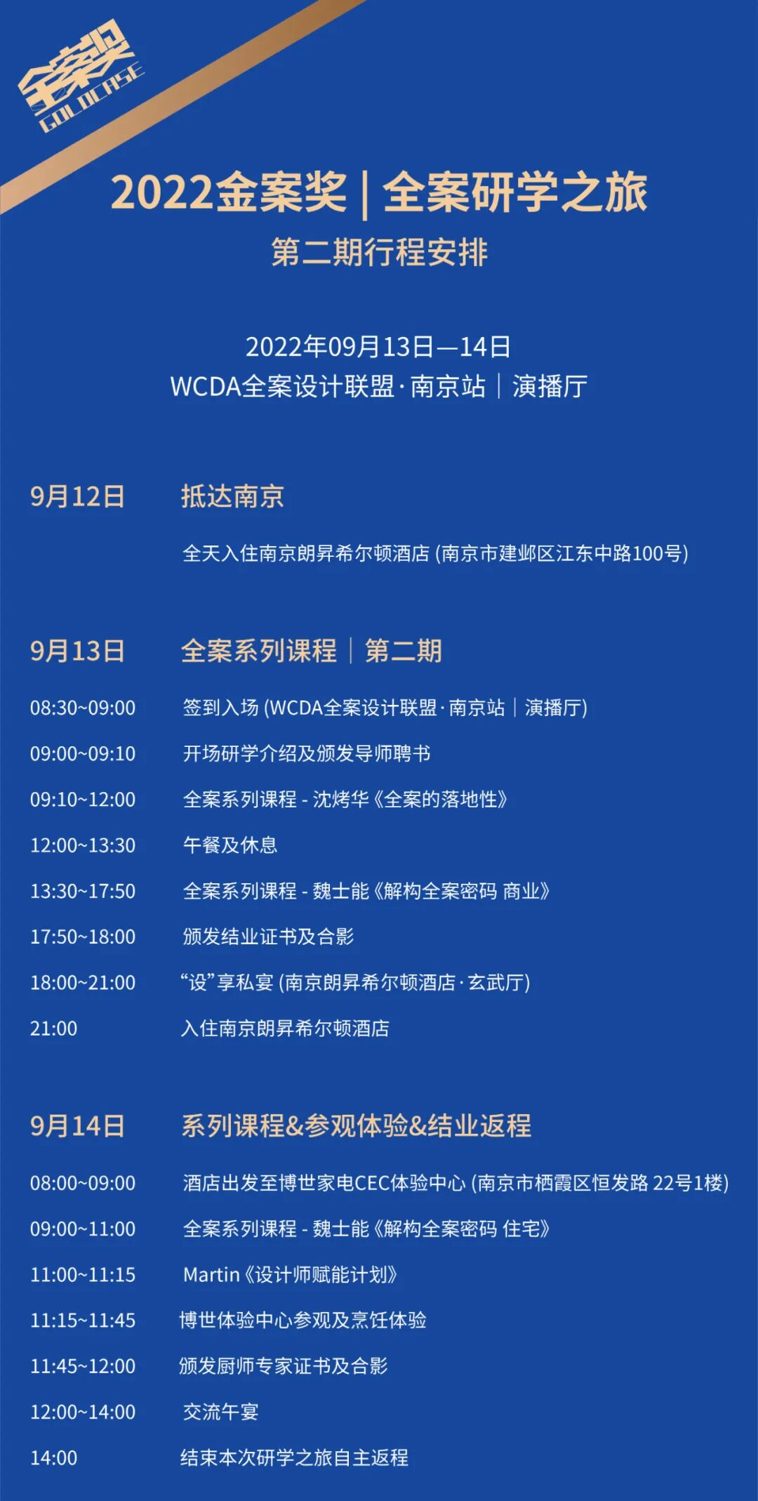 9月13-14日,全案研学之旅第二期继续落地南京为优秀设计师赋能。邀请沈烤华、魏士能两位全案设计领域资深导师,深度解构全案设计密码,帮学员设计师快速建立全案知识系统,突破固有思维,完成对于全案设计认知的升华。