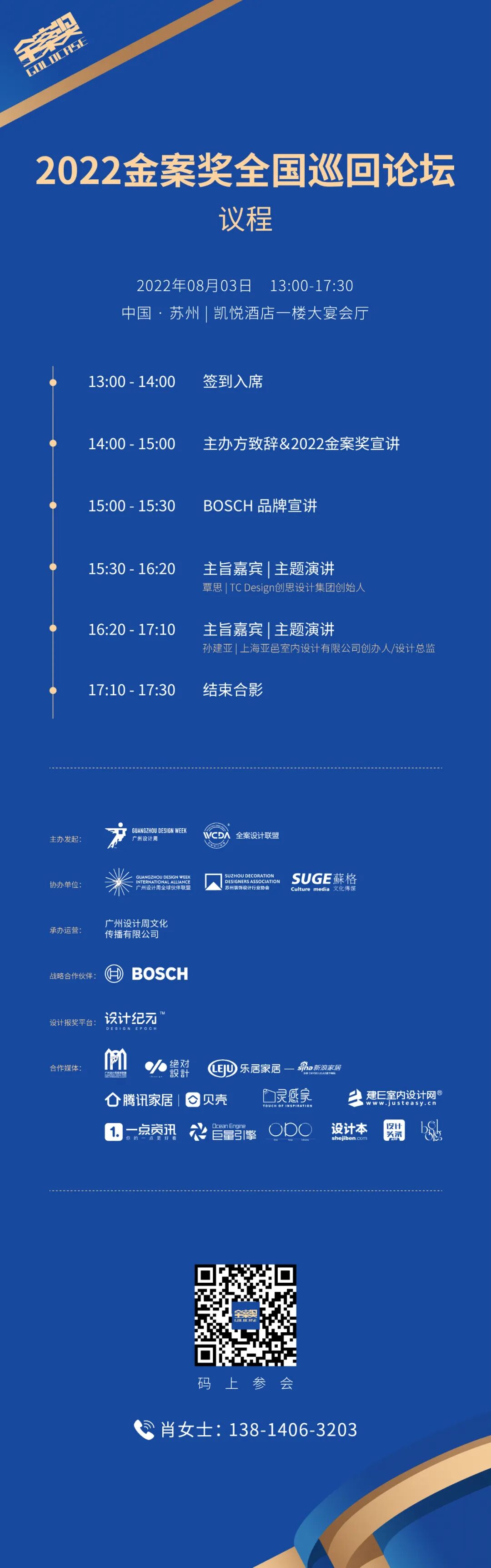 2022年,广州设计周将携手WCDA全案设计联盟、战略合作伙伴博世家电继续踏上推进全案设计发展的征程,开启一场场推广中国全案设计的思想论坛。8月3日,金案奖全国巡回论坛将在苏州举办,届时苏州设计领军人物将作为嘉宾出席,对全案设计的发展寄予厚望。同时,现场将进行2022金案奖重磅发布,共探全案设计故事书写的无限可能,希冀推动中国全案设计新发展。