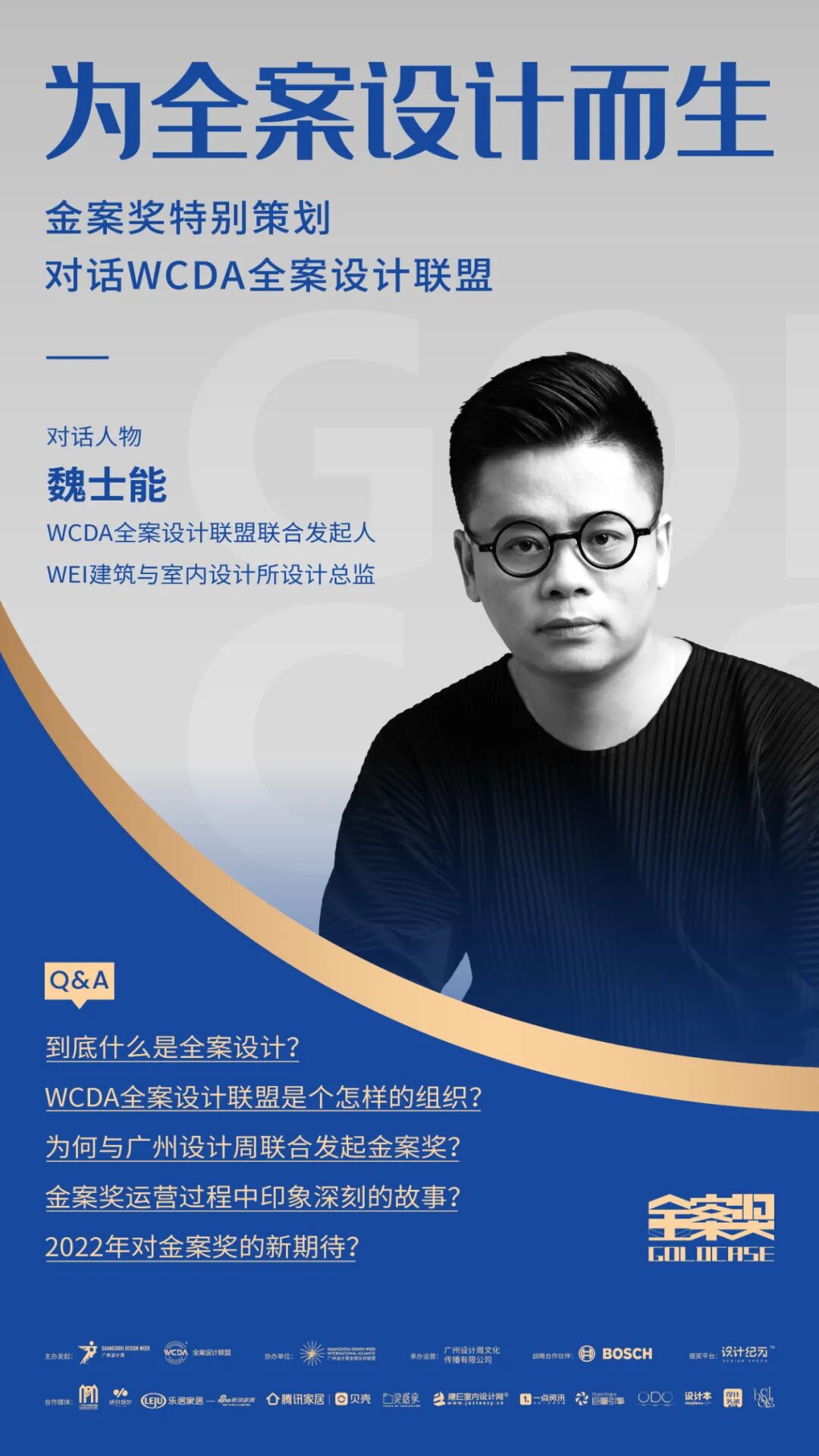 2022年,金案奖特别策划「 为“全案设计”而生 」人物专访,邀请了WCDA全案设计联盟联合发起人、WEI建筑与室内设计所设计总监魏士能先生,一起聊聊对全案设计的理解——什么是全案设计、WCDA全案设计联盟是个怎样的组织、为何与广州设计周联合发起金案奖、金案奖运营过程中印象深刻的故事等。