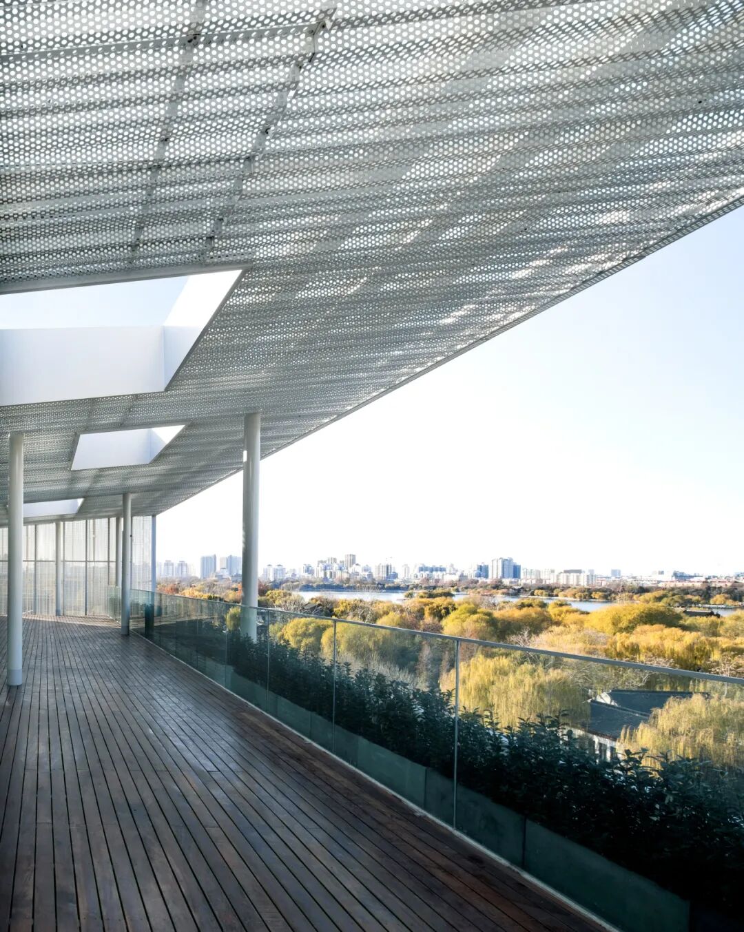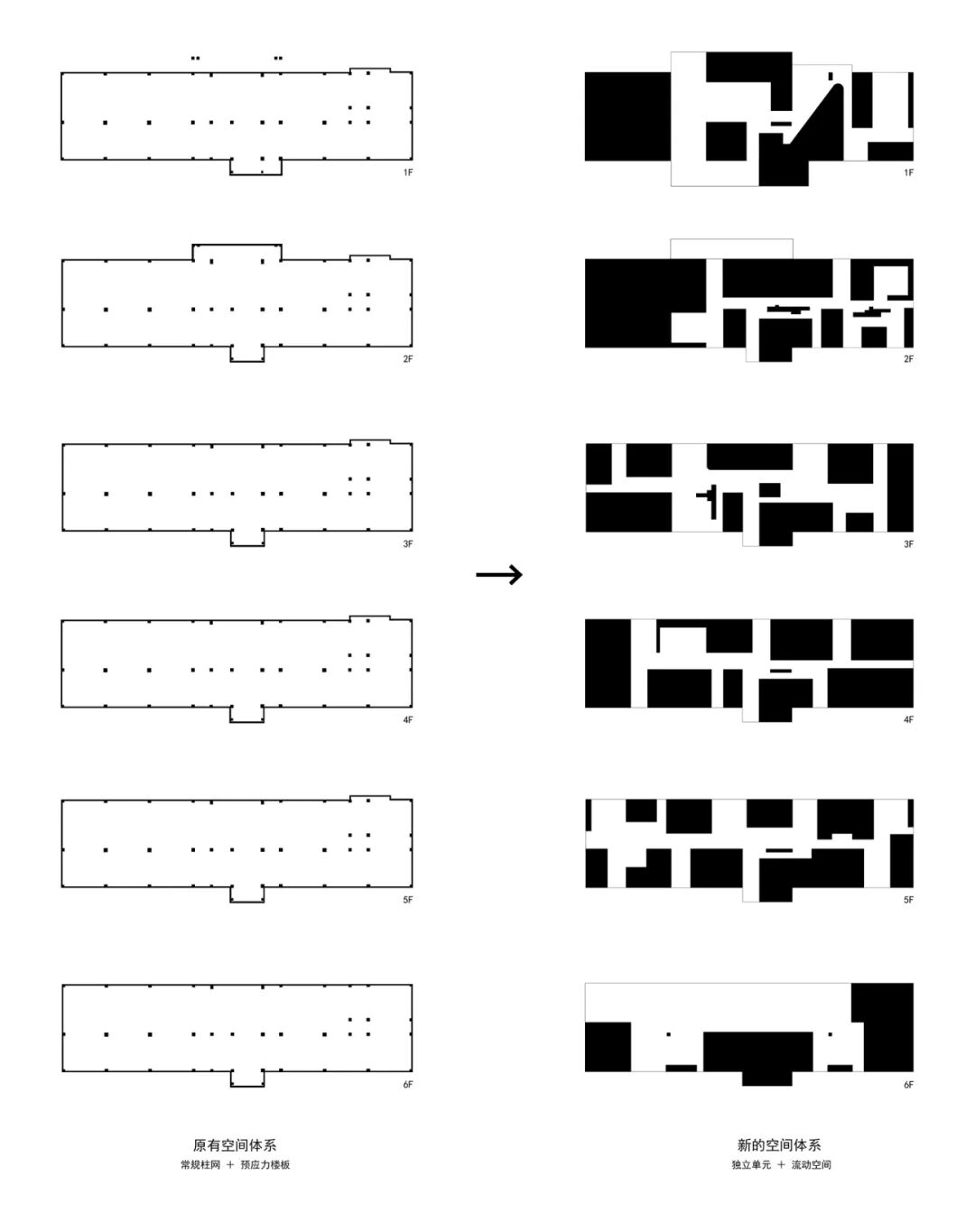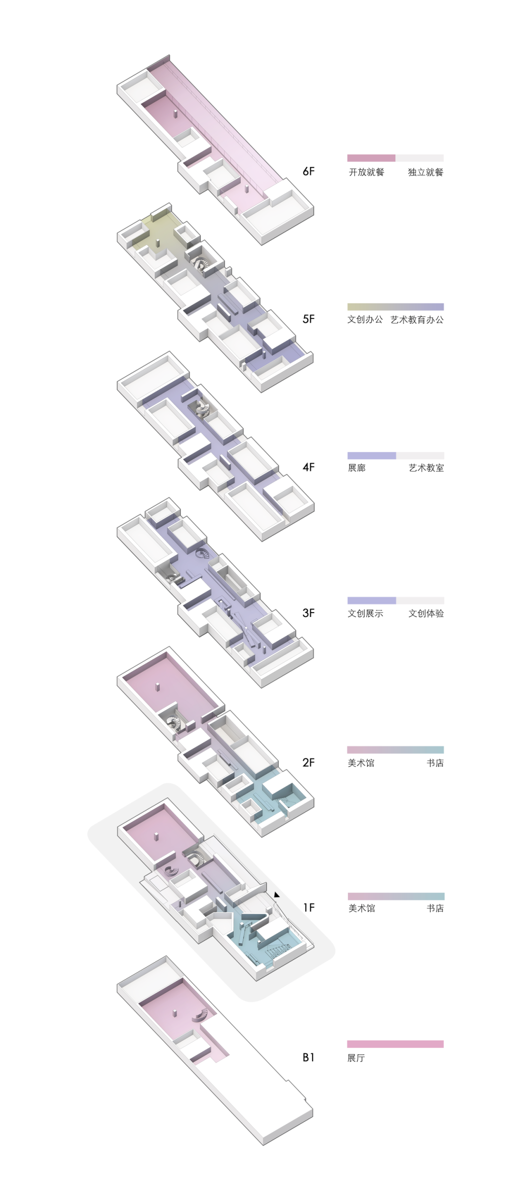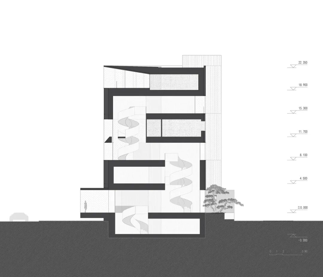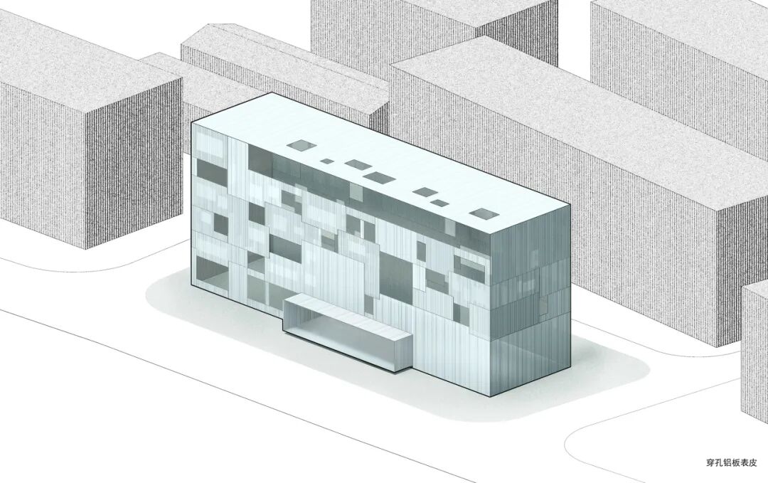 最新文章2023-11-21 济南·明湖100艺术文化中心 / 陶磊建筑 此项目为旧建筑改造,基地位于济南大明湖南岸,建筑置身于略显老旧的传统街区,北侧面对明艳开阔的大明湖面。 ▽ 居住区视角 ▽ 东北角夜景 建筑改造前曾先后作为鲁信文化集团的办公楼和净雅大饭店,而新的建筑将作为艺术文化空间向城市开放,身兼美术馆、剧场、艺术书店、文创体验、艺术教育和特色餐饮等多重职能。全新的多功能复合型艺术空间不仅重新聚合了大明湖的自然景观与湖畔的历史人文街区,同时其简洁鲜明的建筑个性也将激活这片老城区,给这座历史丰厚的城市注入新的活力。 ▽ 原始照片 ▽ 立面局部 ▽ 西北角夜景 ▽ 沿街立面近景 委托方希望建筑能够以新的气象和更为开放的姿态成为济南新文化生活的引领者,成为城市文化和艺术的聚集地。为了建筑新的目标,也为了给这个灰色基底的老城区带来新的色彩,设计从原建筑最基本的条件开始切入。 ▽ 体量生成 建筑原结构为均质的钢筋混凝土框架结构,楼板采用预应力系统。各楼层之间除了楼梯间的连通外,几乎没有任何联系。呆滞的空间加上原本不够充足的层高,共同限制了新建筑作为艺术空间所应有的开放与自由。于是我们将旧建筑的原有条件同新的功能需求重新梳理整合,希望寻求一个由内而外的思路,从根本上实现内部空间的自由和应有的变化,进而影响到外立面,并和北侧开阔的大明湖景色建立联系。 ▽ 开放展廊 我们将一些不适合开放的功能分离出来,形成了一个个相对独立封闭的空间“盒体”,利用这些“盒体”,消隐掉行列均质的结构柱,打破楼层水平向的限制,在六层高的空间框架内自由堆叠、交错、挤压。 ▽ 开放办公 ▽ 办公空间 这些“盒体”之间留出的空白即成为了公共和开放的场所,塑造出一个穿越楼层的、流动的、自由生长的无柱公共空间,各层公共空间在上下层连通的位置垂直生长,而具有水平交通功能的走廊空间也被融入其中,相互联结成一体。原有的结构框架和楼层板得以从视觉中得到解放和消隐。 ▽ 开放空间观大明湖 ▽ 功能分布 这些内核的变化直接显现在建筑的立面和外形上。盒体之间的空白,作为开放的公共空间将北侧的大明湖风景和南侧的阳光最大限度地纳入建筑内部;“盒体”的挤压使建筑产生了更具穿透性的内部空间,由内而外,更加强化了外部开口处景观的通透感。 ▽ 开放空间 ▽ 各层功能分析 建筑各部分功能属性的界定并非垂直割裂的,人的使用边界也不应被楼板生硬地切分开,正因如此,在内空间的营造上,将原结构中被净雅饭店拆改过的楼板做部分拆除,尽可能不给原始结构带来二次伤害,更重要的是借此机会打通楼层之间的联系,建立公共部分新的空间高度,使之不受限于原有的层高。 ▽ 入口书店 ▽ 办公空间 ▽ 独立空间 建筑以美术馆、剧场、艺术书店、文创体验和艺术教育组合成不同属性与氛围的艺术空间,与之相关的信尚书店、信尚美术馆及中央美术学院大众美育功能等都依托于这些开放的场所,艺术与商业交融在一起,没有明确的物理界限。美术馆、书店和文创体验通过上下层开口处的公共楼梯贯穿多个楼层,使艺术空间得到最大程度的共享。 ▽ 美术馆挑空(待二次精装施工) ▽ 旋转楼梯(待二次精装施工) 在新建立的跨层公共空间中,增加了完全开放的交通系统,旋转楼梯如雕塑般垂直延伸,连接不同高度的平台。设计保留了垂直电梯的便利性,而新增的开放的交通在空间中不断转换位置,在漫游中穿越不同的功能,增强了建筑的体验感,使各个楼层与地面建立了联系。 ▽ 西北角日景 ▽ 东北角日景 为了使这些被堆叠的盒体空间成为一个整体,我们在建筑体的外表面包裹了一层铝板,同时,铝板被设计成有着不同通透率的冲孔铝板,这样不仅呼应了不同的内部空间,也使得被包裹的盒体空间可以被街道上的行人所感知。被折叠成瓦楞状的铝板,自身可以产生足够的应力,背后不必产生多余的结构。 ▽ 顶层观大明湖 通过铝板冲孔而形成的独立空间的窗,和公共空间的空白共同叠加在立面上,形成了错落有致、大小不同的图层印记,公共部分也更凸显出了开放性,就此,崭新的立面形成了。 ▽ 区位总图 ▽ 空间系统分析图 夜晚时分,内部灯光从表面的孔洞和开口中透射出来,将整个建筑渲染成一盏温润的明灯。内部空间因错动和连续变得既独立又混合,形成了一个立体丰富且又开放自在的艺术生活体验中心。 原有放置在屋面的设备被移走,改造成了带遮阳的半户外餐饮活动场地,这里可以一览大明湖的全景,尽情享受济南历史名城的美丽风景。 (注:设计中内部垂直空间和开放的旋转楼梯因为特殊原因将作为二次施工中实施,本次施工中已完成了结构加固和条件的预留。) ▽ 平面图 ▽ 立面图 ▽ 剖面图 ▽ 节点细节 项目名称:明湖100艺术文化中心 (中央美术学院┃山东艺术教育中心) 项目类型:建筑+室内+景观 项目地点:山东济南明湖路100号 设计单位:TAOA陶磊建筑 事务所网站:www.i-taoa.com 主创建筑师:陶磊 设计团队完整名单:陶磊、陈真、周余牧零、段振强、李根、徐莉莉、石彤、孙朗、戴韵怡、黎继明 实习生:孟祥瑞、刘子莘、满人方 业主:山东文旅集团 建成状态:建成(室内挑空区待二次精装施工) 设计时间:2017-2019 建设时间:2019-2022 建筑面积:5805.85平