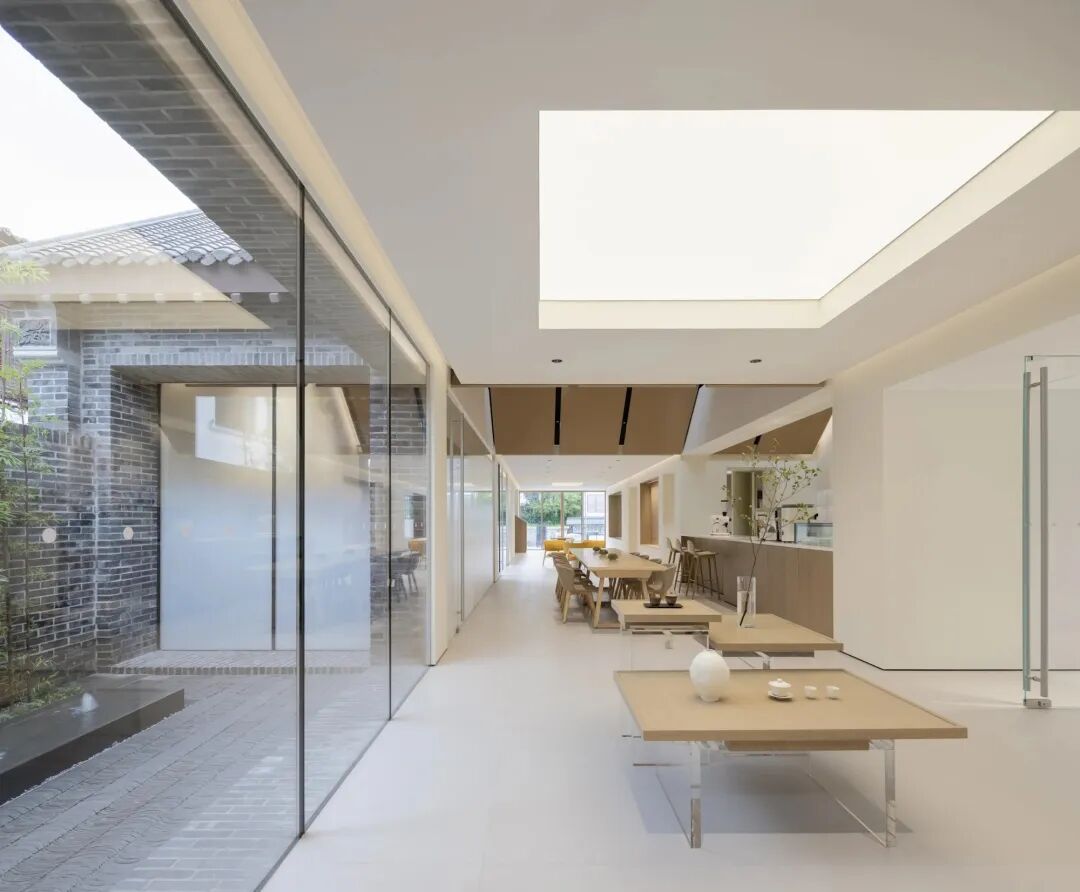 这座双层建筑位于黑虎泉附近的宽厚里广场,最初建于2015年,是一个有三个斜屋顶和两个内院的展览空间。后来,这里被改为商业店铺,室外庭院被舍弃从而获得更多的室内空间。Lukstudio恢复了原有的建筑秩序,并整合了一个现代的开放式方案。"新"的现代设计方案与"旧"的灰砖混凝土建筑并存,营造了一种进步与和谐的感觉。