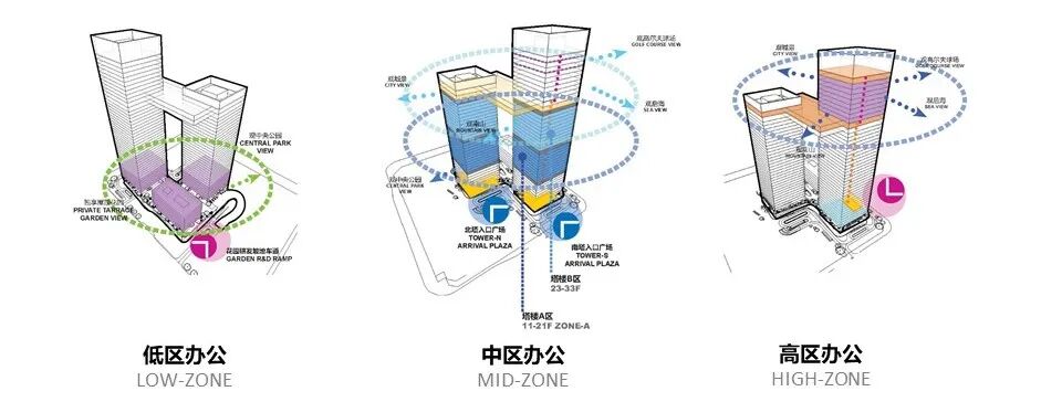 项目分别在地面(下)、三层平台庭院(中)、150米高的连廊(上),多维度打造出“下”、“中”、“上” 三个体系的景观交往空间。