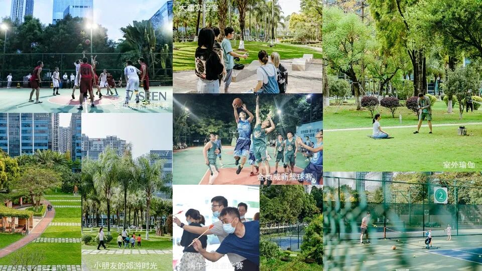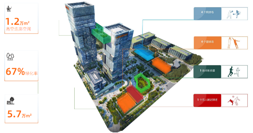 金地威新中心项目总建筑面积 28万平方米,总绿化覆盖率超67%,旨在打造健康、自然、活力的下一代办公园区。园区内配置了一条花园跑道,四个标准篮球场,四个国际标准网球场,一个五人制足球场,一个健身房,一家幼儿园,供园区工作人员和市民使用。同时,园区也经常组织多种形式的运动会、读书会、节庆主题活动等,最大程度发掘场地潜能。