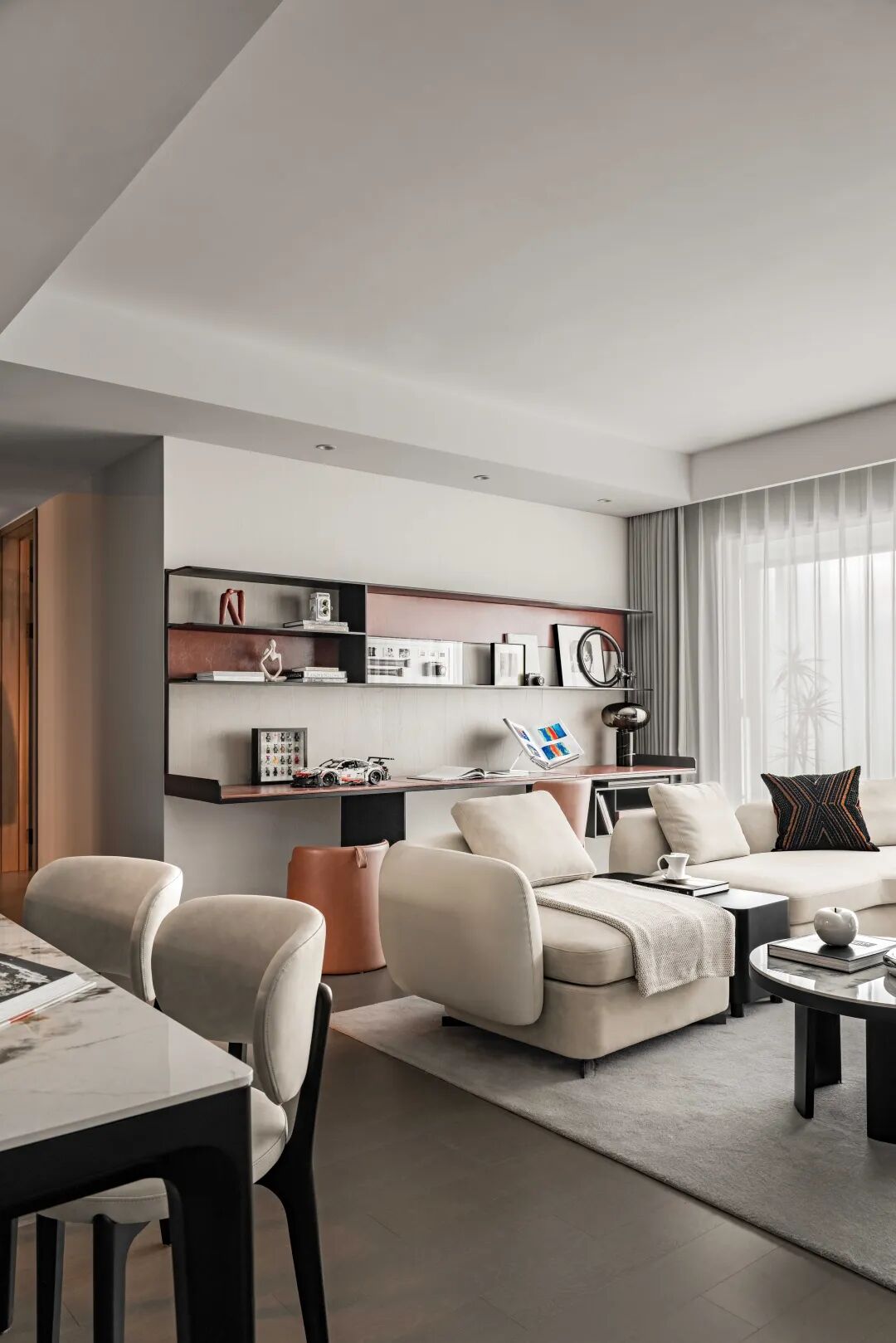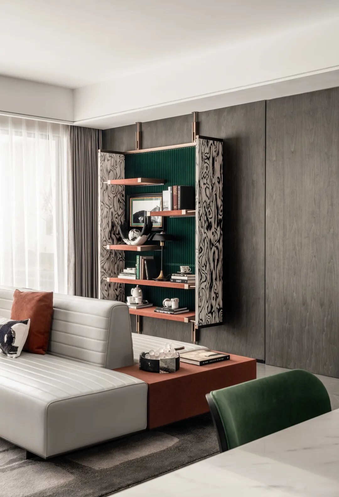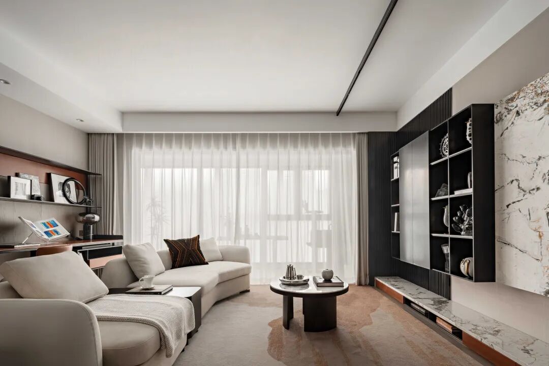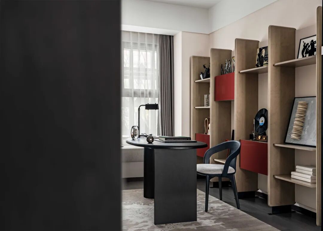 以现代主义去融合江南文人的含蓄与静默,书房中以大面积陈列架衡量空间尺度,突破传统书房的采光样貌,搭配落地飘窗,引入自然光以慰藉内心的精神世界。