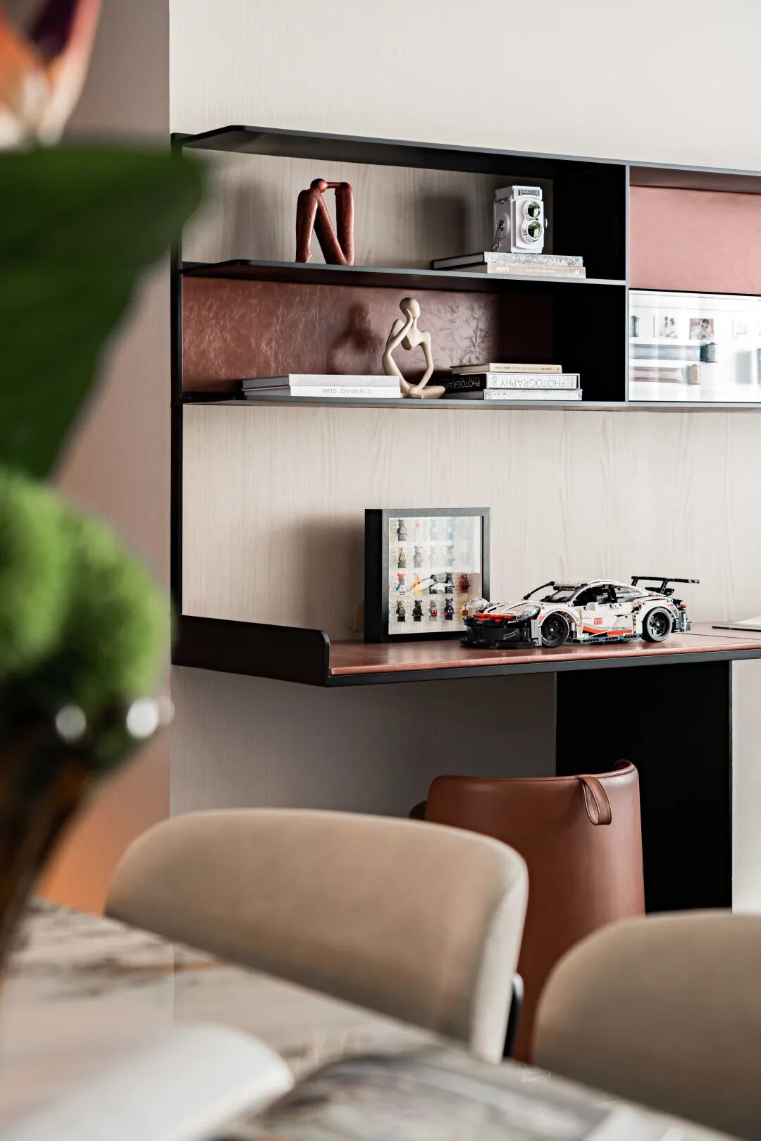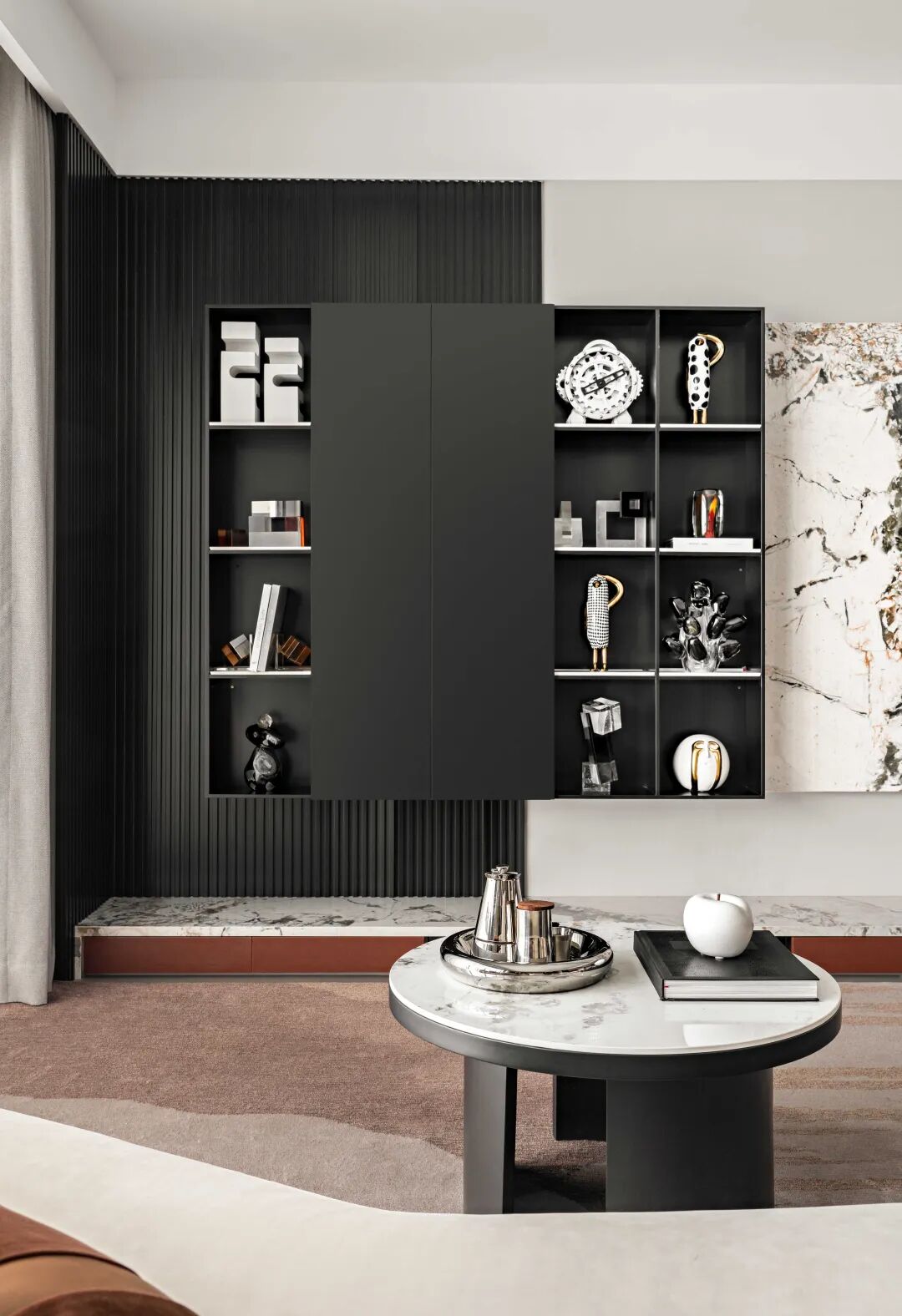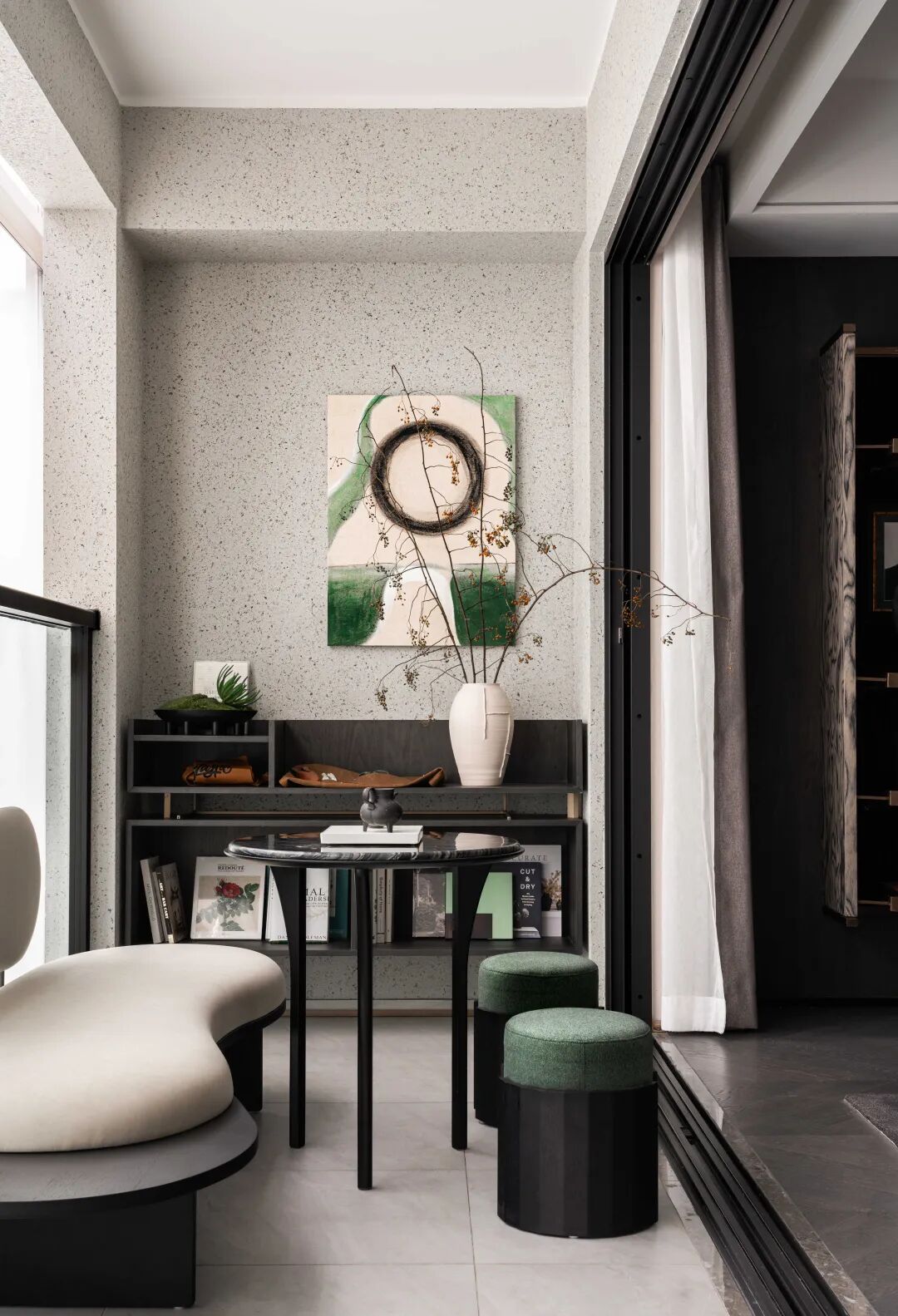 以现代主义去融合江南文人的含蓄与静默,书房中以大面积陈列架衡量空间尺度,突破传统书房的采光样貌,搭配落地飘窗,引入自然光以慰藉内心的精神世界。