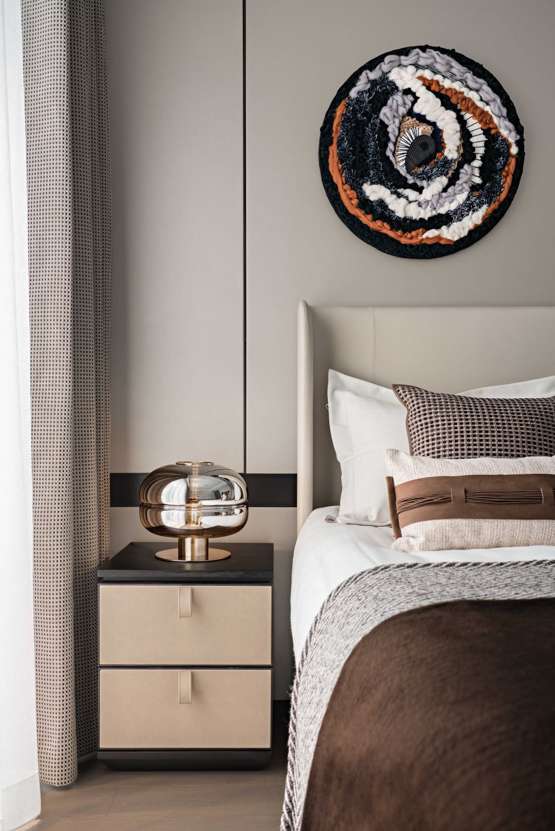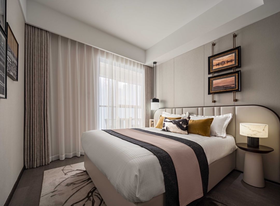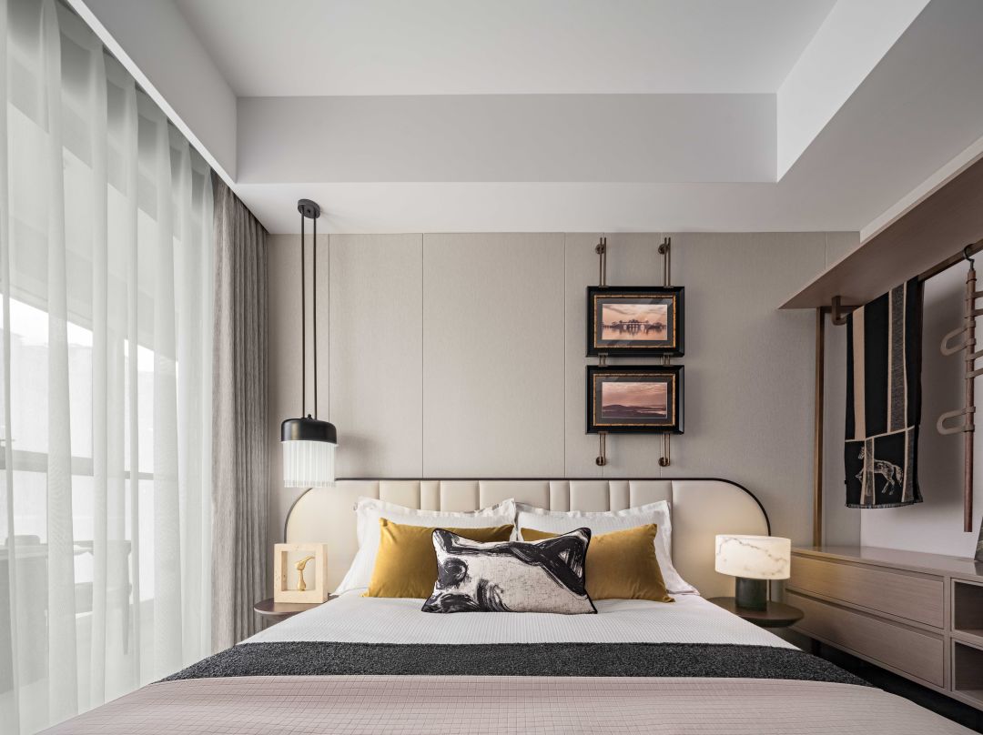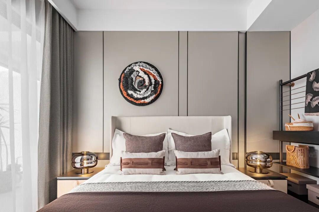 床头柜对称排列台灯,为空间注入清新而独特的空间效果,亦成为了温馨环境中的一抹理性的光点。