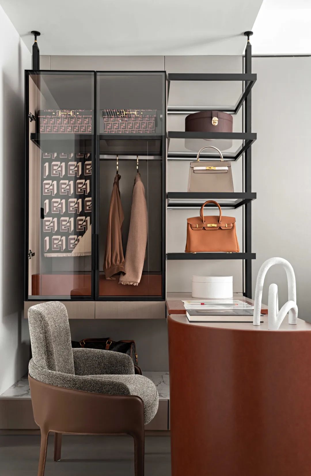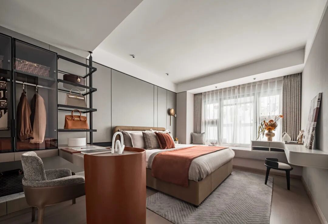 随着空间动线步入主卧,才算是进到空间叙事的高潮。衣帽间与梳妆台贯通在一条视觉线上,全透明的飘窗予以空间温柔的自然光线。