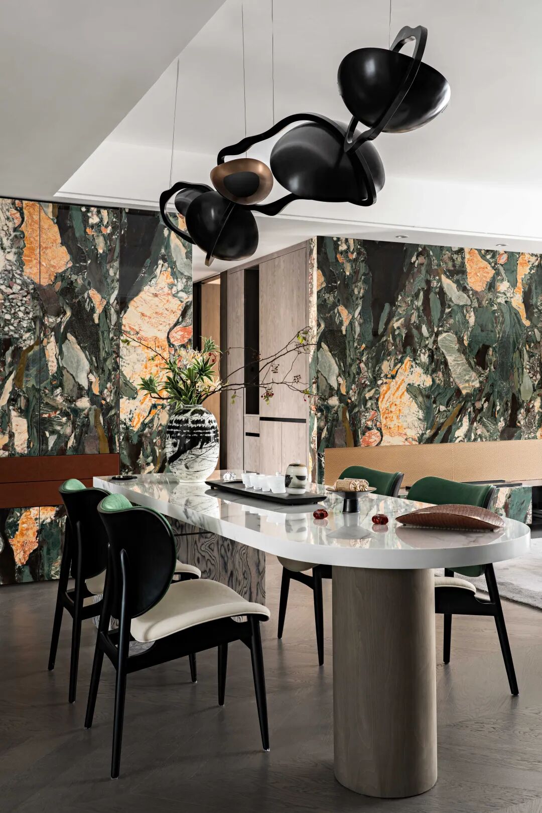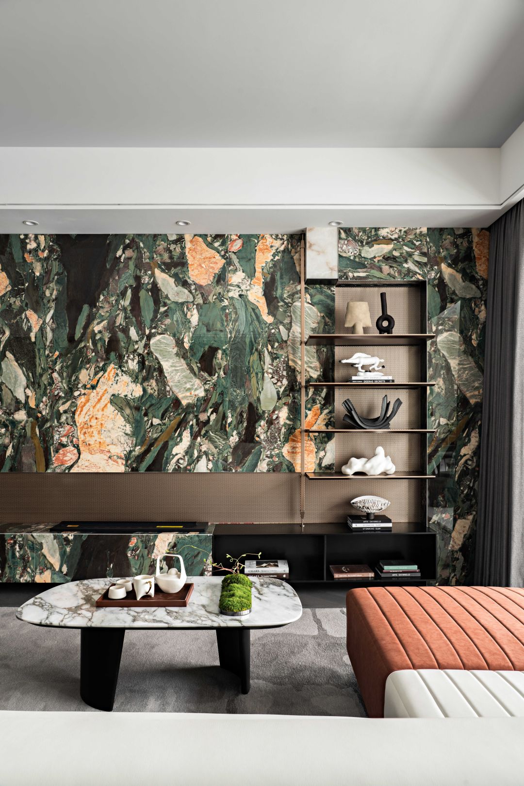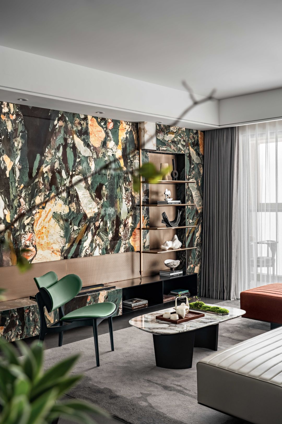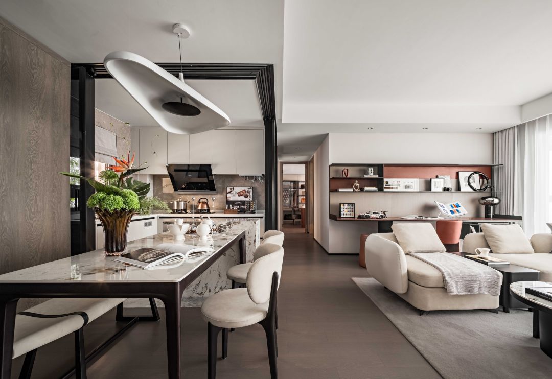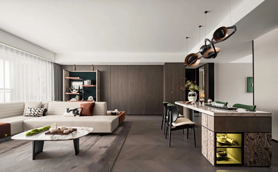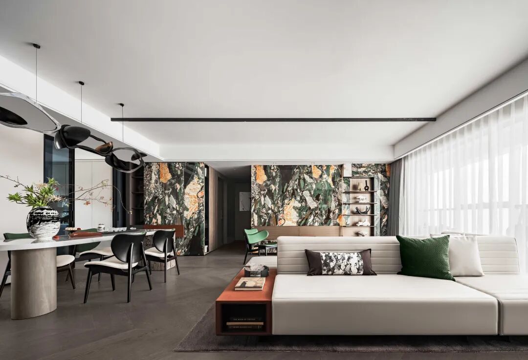 透过色彩的转换定义空间不同主题的情绪表现,原始森林般的大理石墙面带来自然特色,开放式的空间架构透过型态的切割,创造出不同框架式户型上的空间效果。