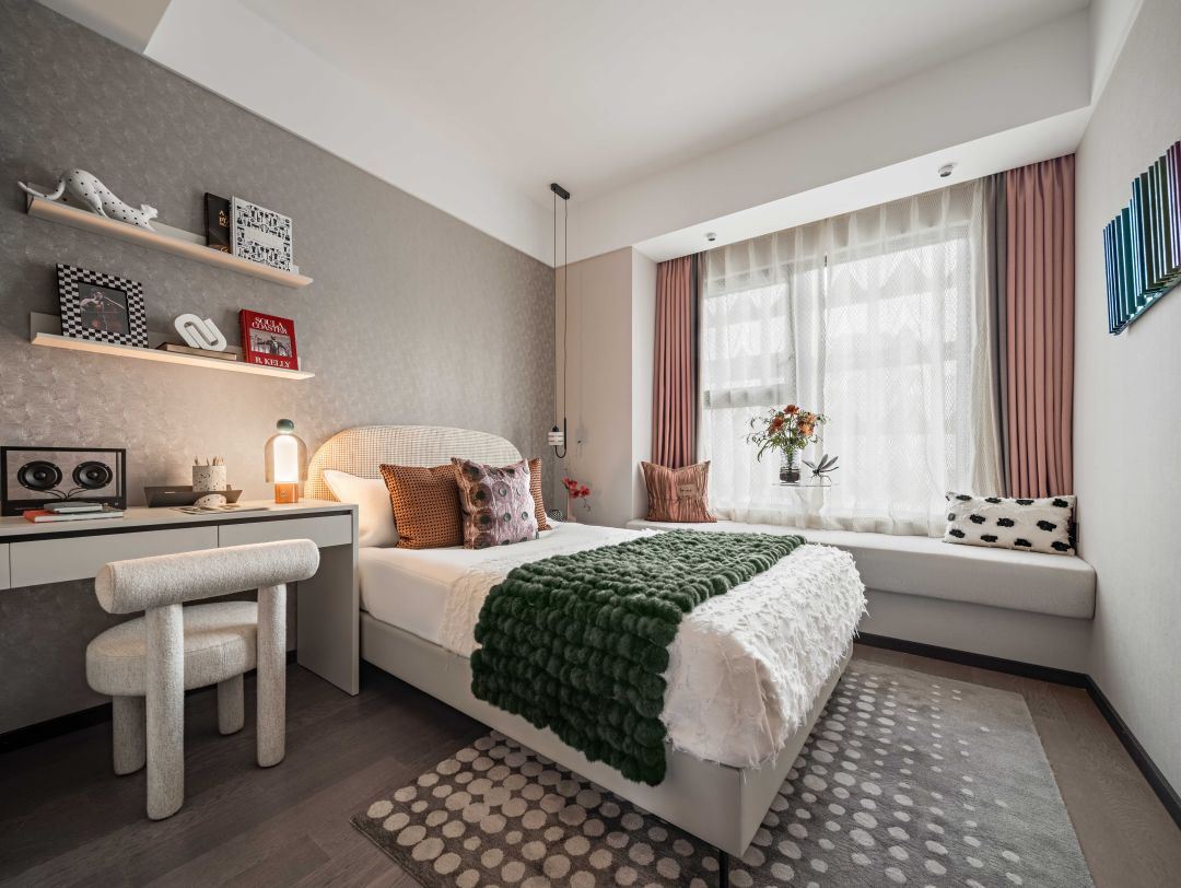而在大的空间氛围,如墙面色彩、家具选择上则选择更加温和的颜色,配以贝母饰样的壁纸打破纯白墙壁的无聊,潜移默化中培养孩子的审美趣味。