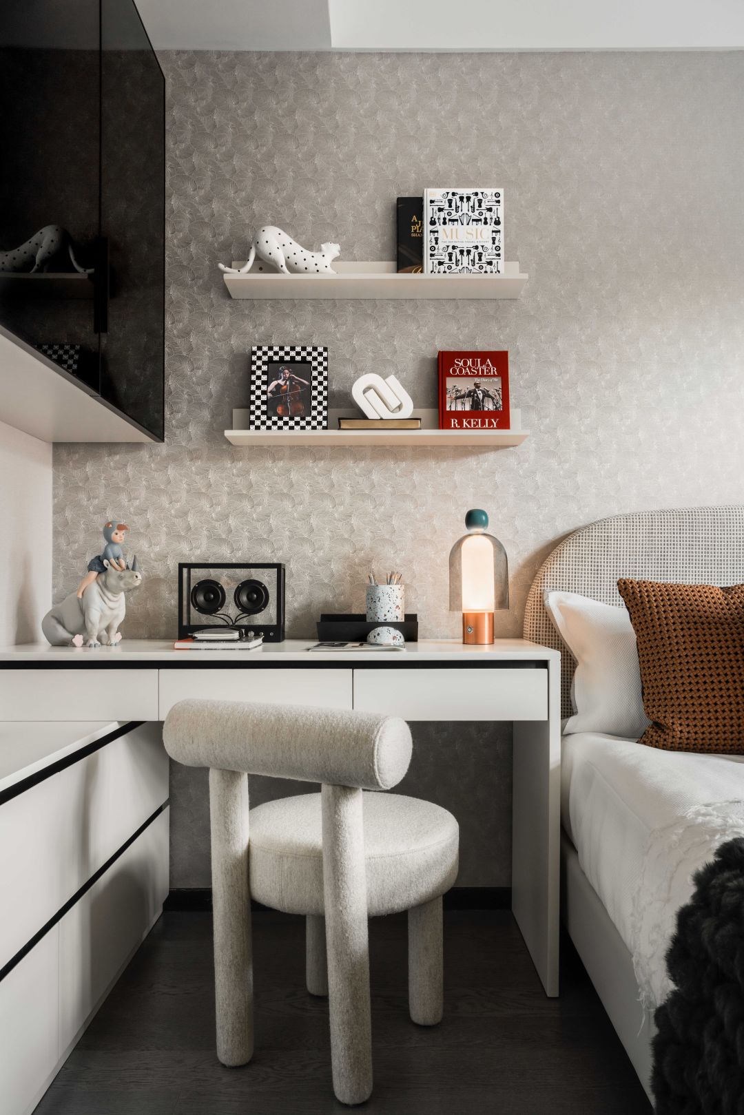 儿童房的设计上摆脱了过分童趣的设计手法,只用一些装饰画、台灯、复古音响等小的软装元素谱写孩子的天性。