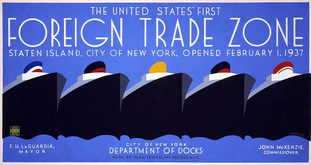 美国第1号对外贸易区海报。1937年,纽约斯塔顿岛的斯台普顿。[By Jack Rivolta, WPA Federal Art Project]
