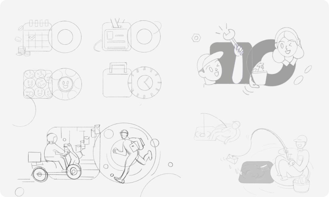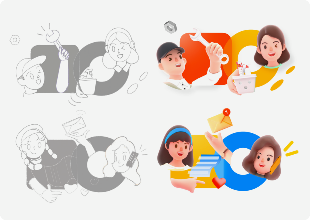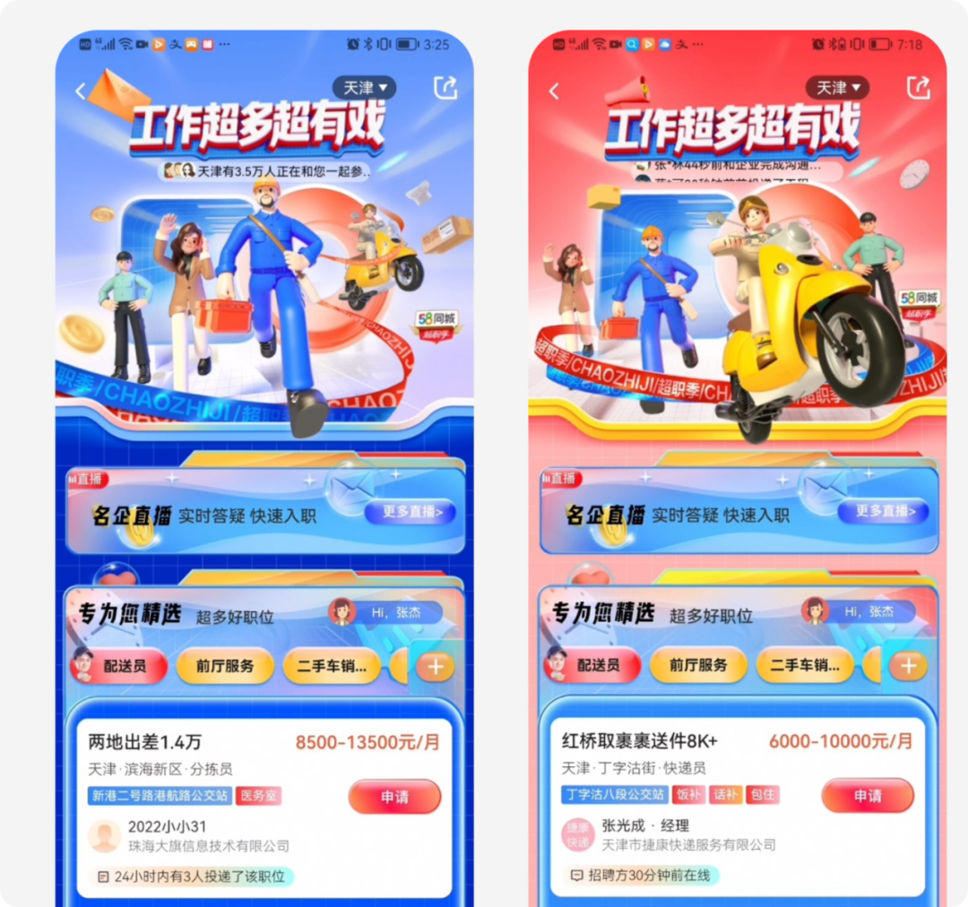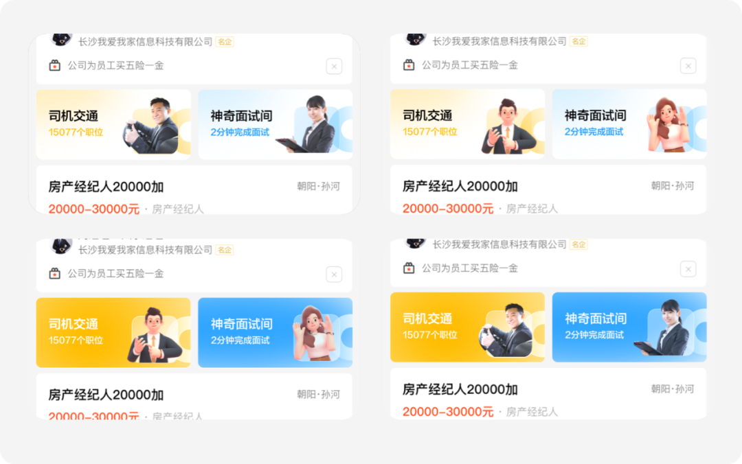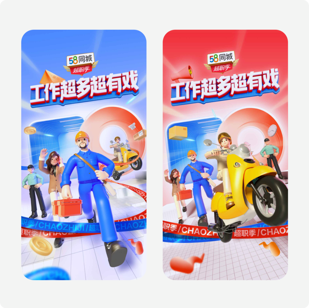 2.人物角色IP:3D人物是58UXD Faceteam设计团队打造的另一设计利器。我们将人物在招聘业务线进行延展应用,符合招聘场景特点的IP是画面的灵魂,现实⽤户透露出的不⾃信,我们给予更多的⿎励及归属感氛围的营造。因此在场景语言打造上我们将Faceteam人物造型融入招聘职场场景,更贴近用户心理需求,展现自信、希望、积极的积极态度。