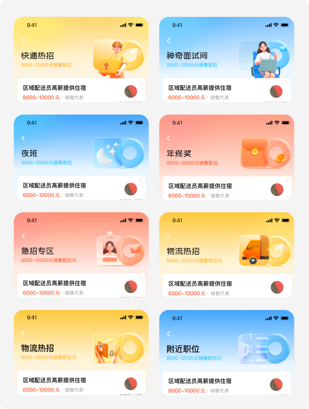 3.设计元素组件:搭配的具有职场专属物品,能更直观、更亲切、更能贴近用户求职场景。创建招聘行业属性组件库,储备设计元素,对精致画面及输出提效有很大作用。