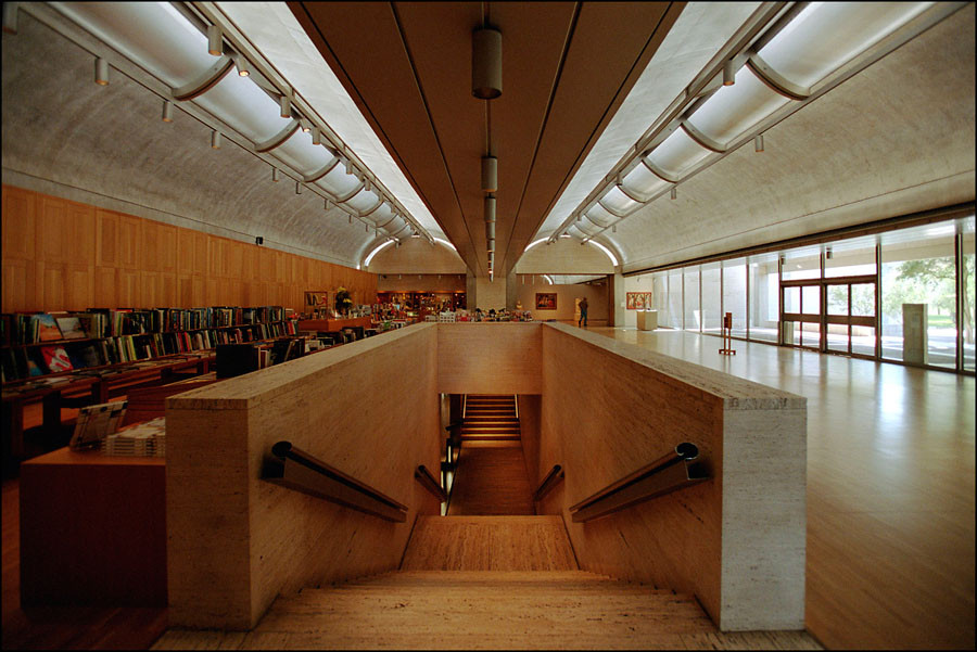 金贝尔美术馆简单质朴却又丰富高雅,建筑的丰富性来自于路易斯·康对每一种材料的尊重。结构体是混凝土的,在阳光下变得鲜活;地面是橡木的,脚丫踩上去暖暖的;屋顶是铅制,在美国西南部阳光的下反射出柔和的光芒。