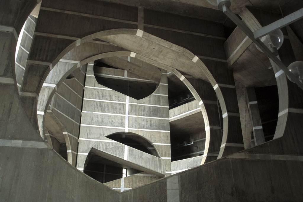 路易斯·康职业生涯最具野心的作品,也许就是为孟加拉国设计的达卡建筑群。达卡议会大厦的外观和象征着永恒的瞭望台十分相似,强烈的几何形式像是追寻着宇宙的秩序,路易斯·康把从万神庙里对穹顶和自然光的感悟应用到了这座建筑上。在建筑内部,台阶和坡道等元素纵横交织,从顶棚上面的开口和侧面圆形开口射进来的光线以及建筑结构将我们带入一个神秘的世界。