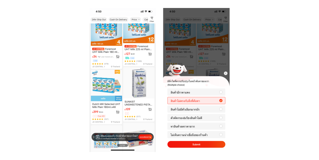 例如京东泰国站在搜索列表翻到一定深度时,会发出反馈问卷,及时了解用户是否遇到了什么问题。