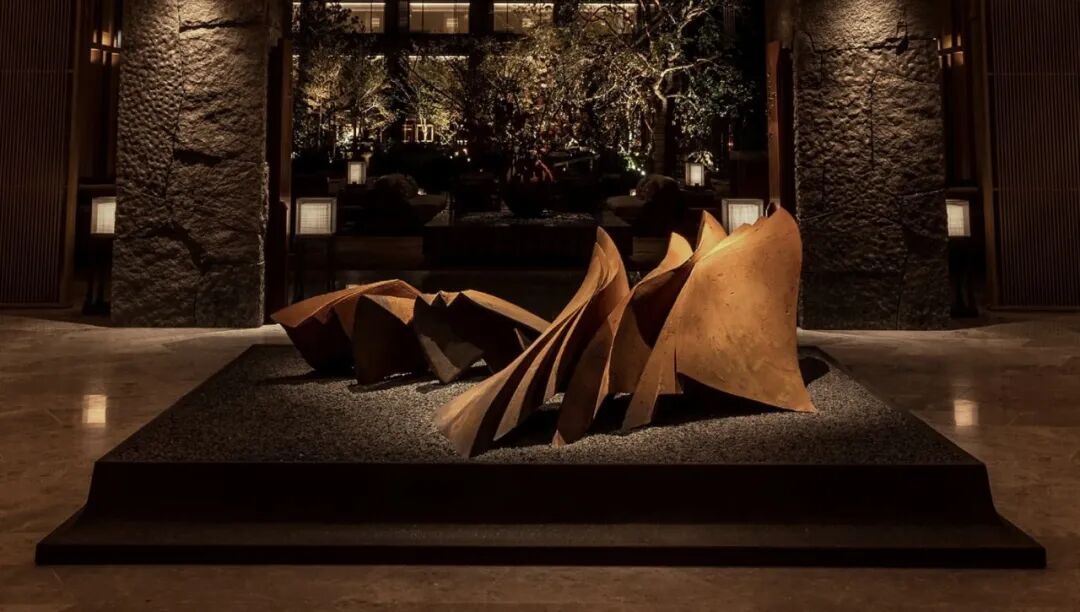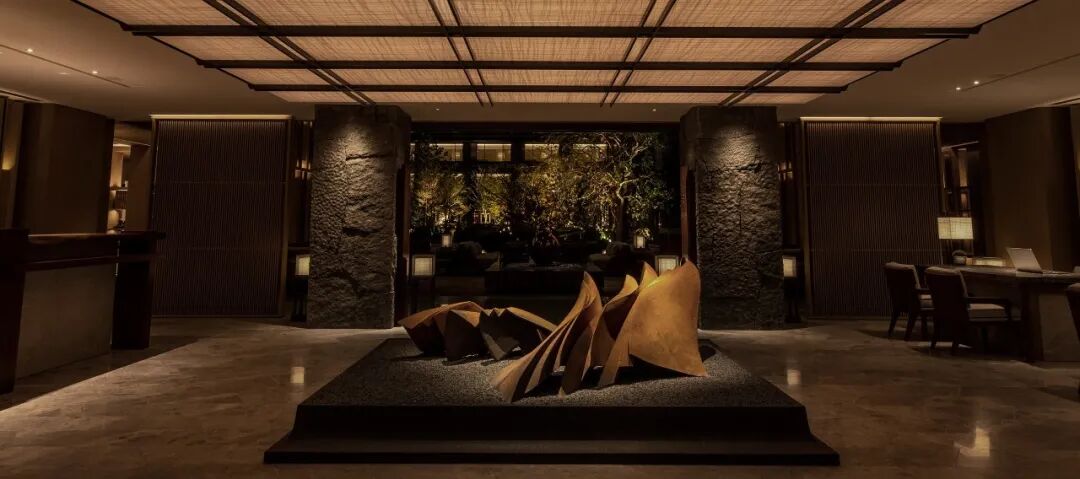 为了增强大堂区的私密感,André Fu傅厚民用无花果木包裹了墙壁,并在天花板上悬挂了一个巨大的Shoji灯笼。大堂中心放置了与日本艺术家yukiya izumita合作创作的艺术品,展现着古代和现代、脆弱与韧性。