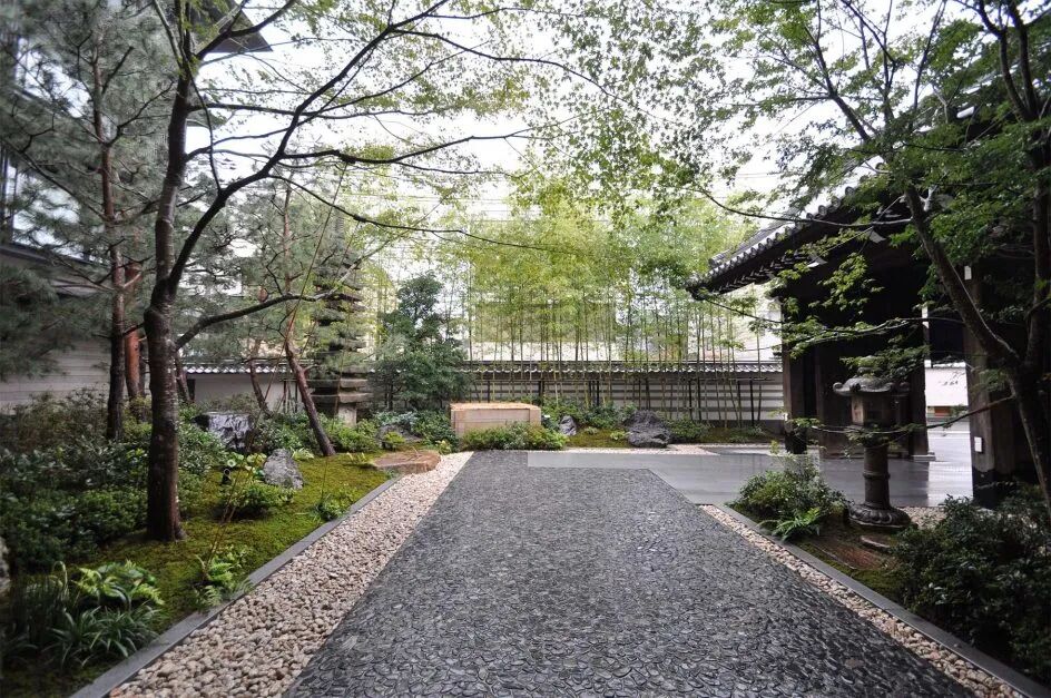 京都古城则以园林与建筑和谐闻名。被改造成四边形的庭院布局,休闲区、室内花园与庭院水镜和谐融合,正体现了“teioku ichinyo”——庭屋一如的概念。