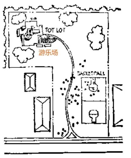 程式化的行为总结,自然会导向程式化的设计。咱们举个书中的例子,下图中有个儿童游乐场,它位于与篮球场有一定距离的一个角落里,和那些在篮球场上喧闹不休的青年人隔开一个空间,这样既满足了年轻人锻炼的需求,也保证了小孩子有相对安全私密的空间玩耍。从地点选址来看似乎很合理,没什么毛病,可结果呢?让人意想不到,游乐场并没有多少孩子光顾,逐渐荒废。